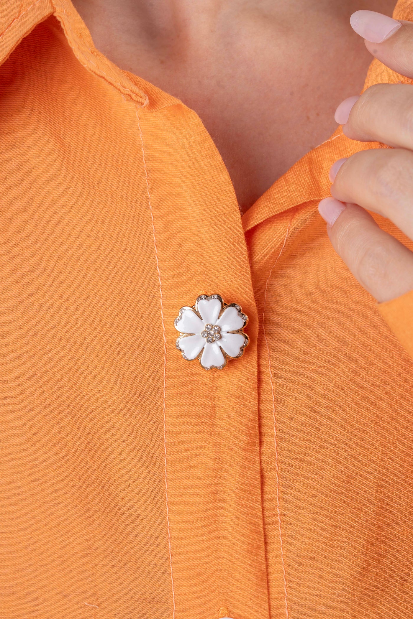 Elodie is a delicately sculpted floral button cover crafted in luminous white enamel and framed with refined gold-tone edging. Finished with a subtle crystal center, it brings understated elegance to any blouse or shirt.