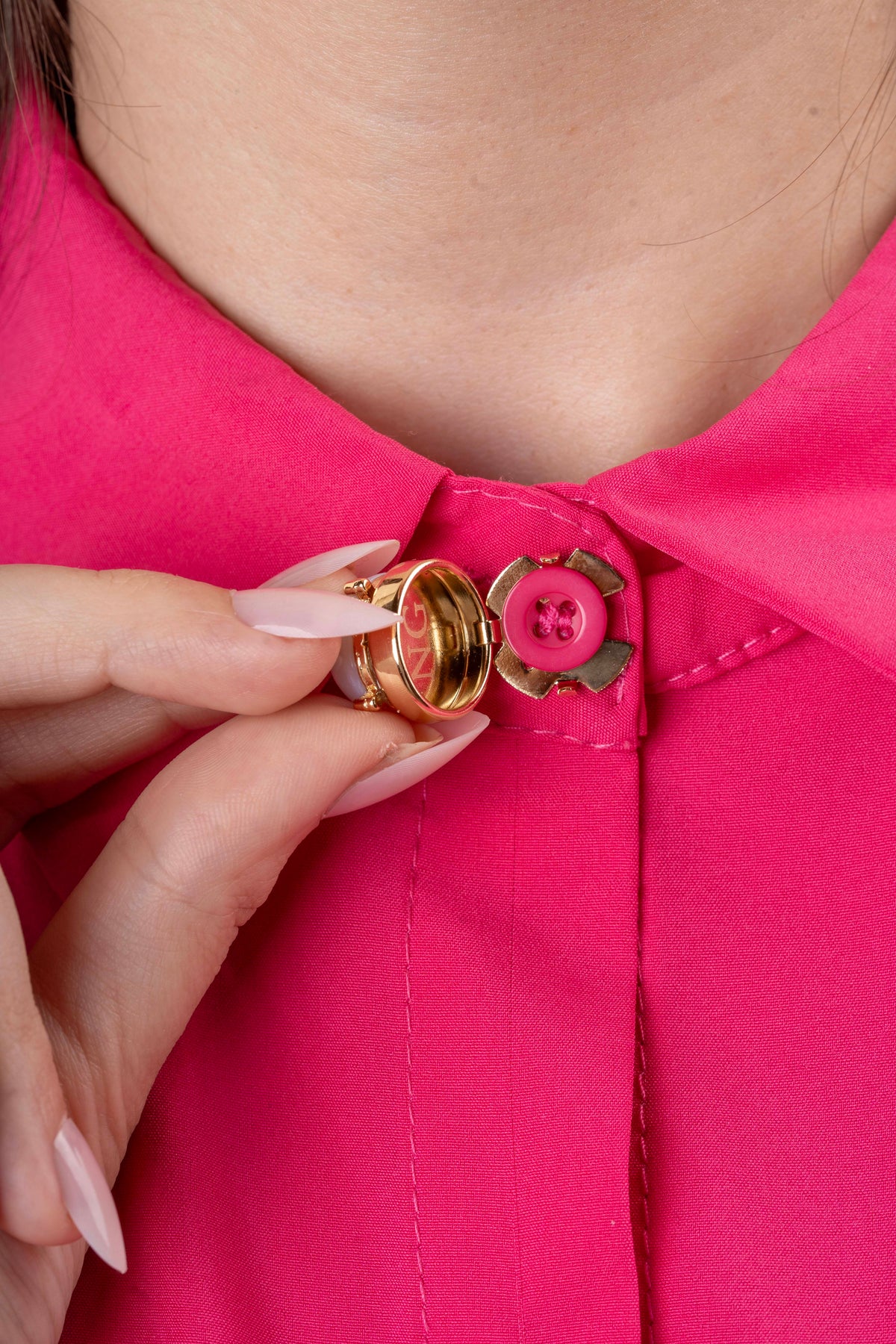 Designed to clip securely over your existing button, Perla transforms a simple look into a polished statement of quiet luxury — no sewing or alterations required.