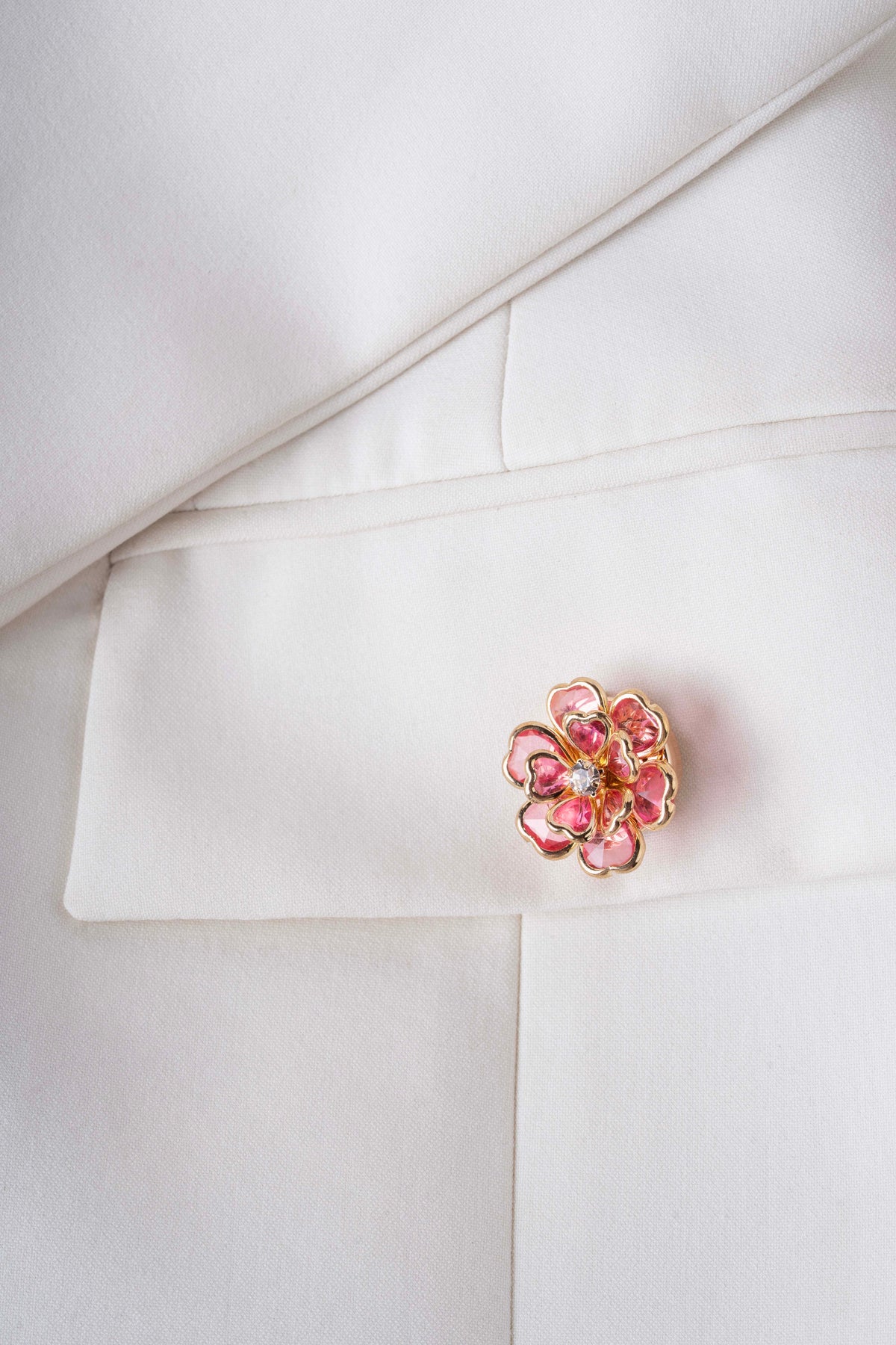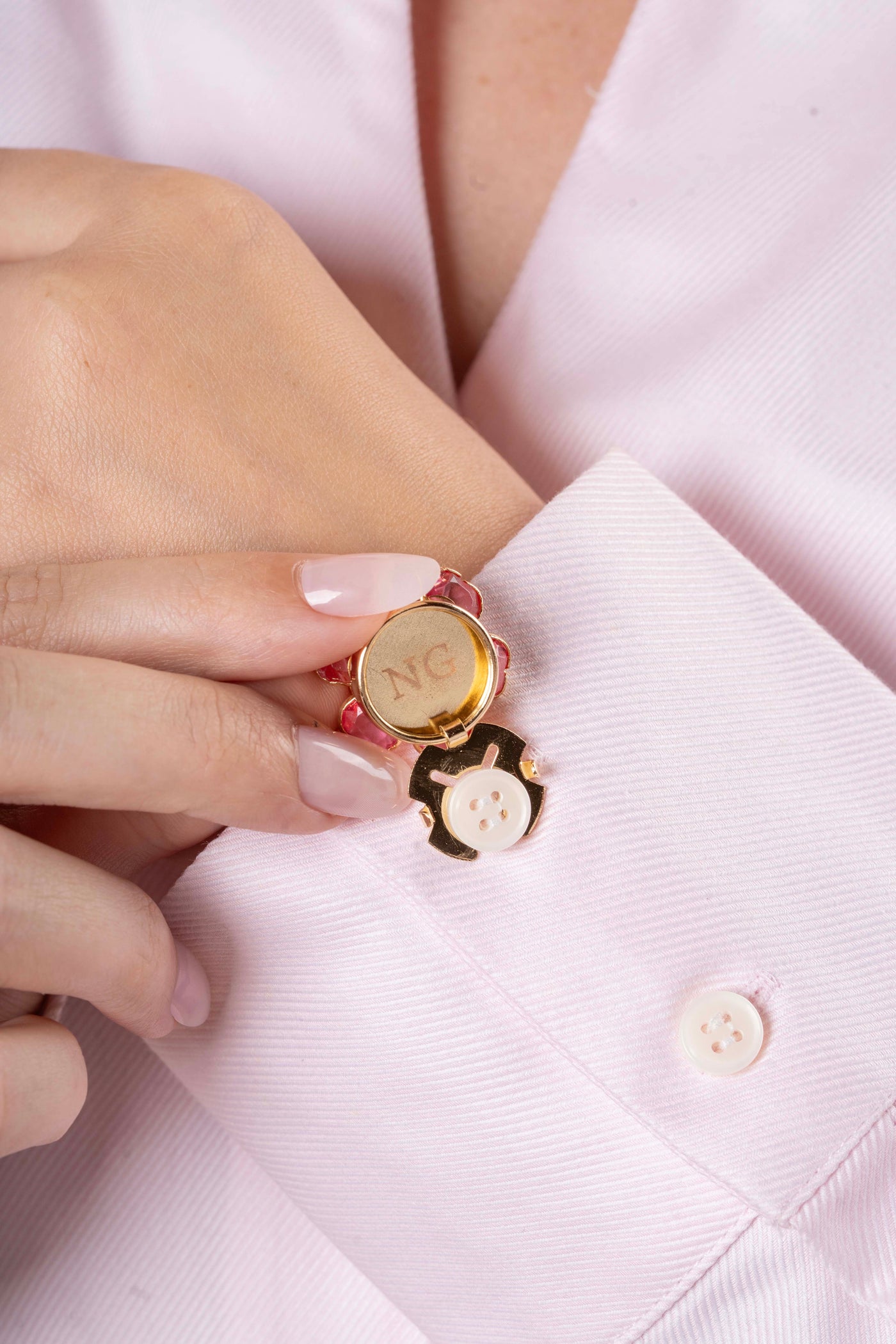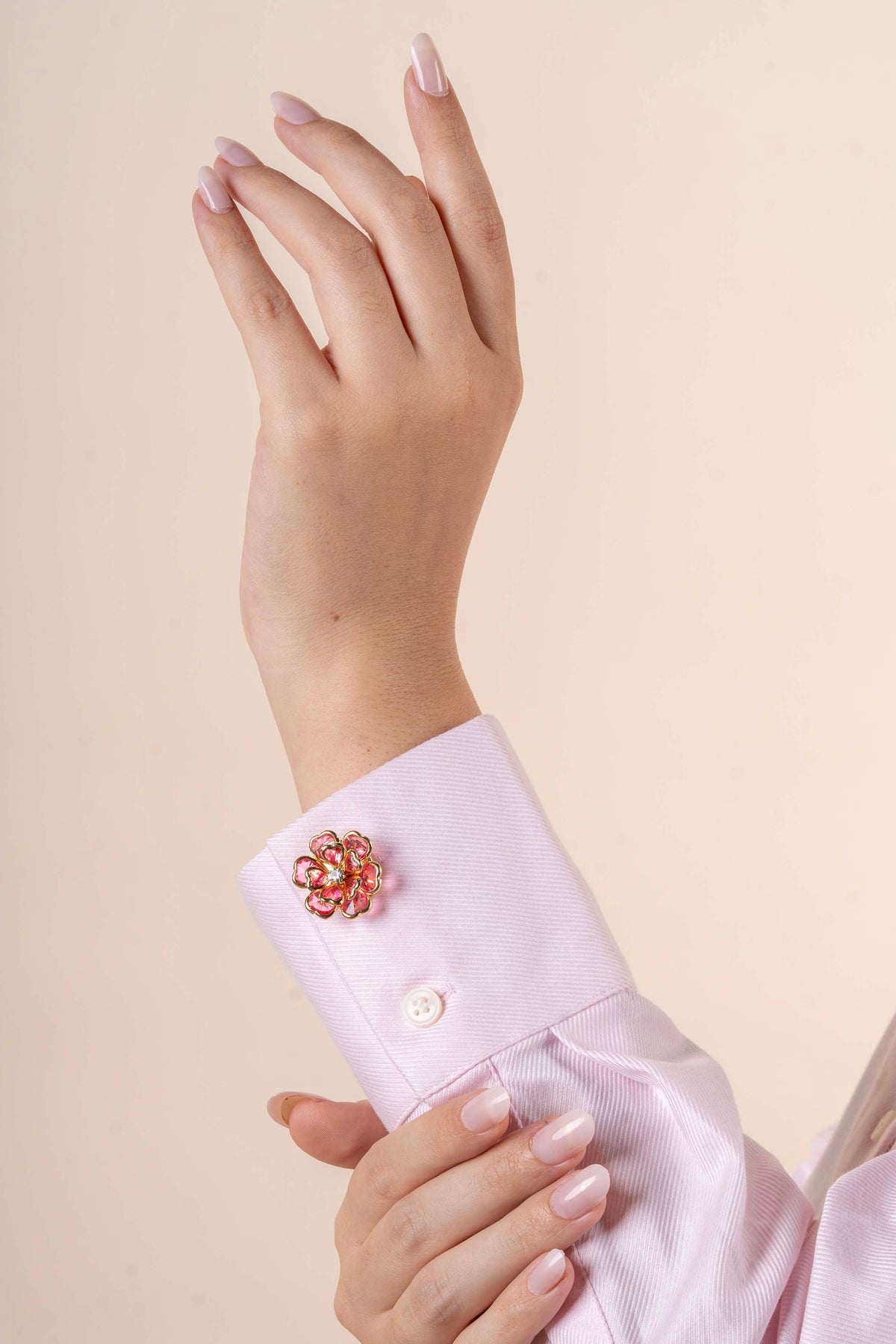Calista is a sculpted floral button cover adorned with vibrant rose-toned crystal petals and finished with a luminous center accent. Framed in polished gold-tone detailing, it adds depth, color, and refined elegance to any blouse or shirt.