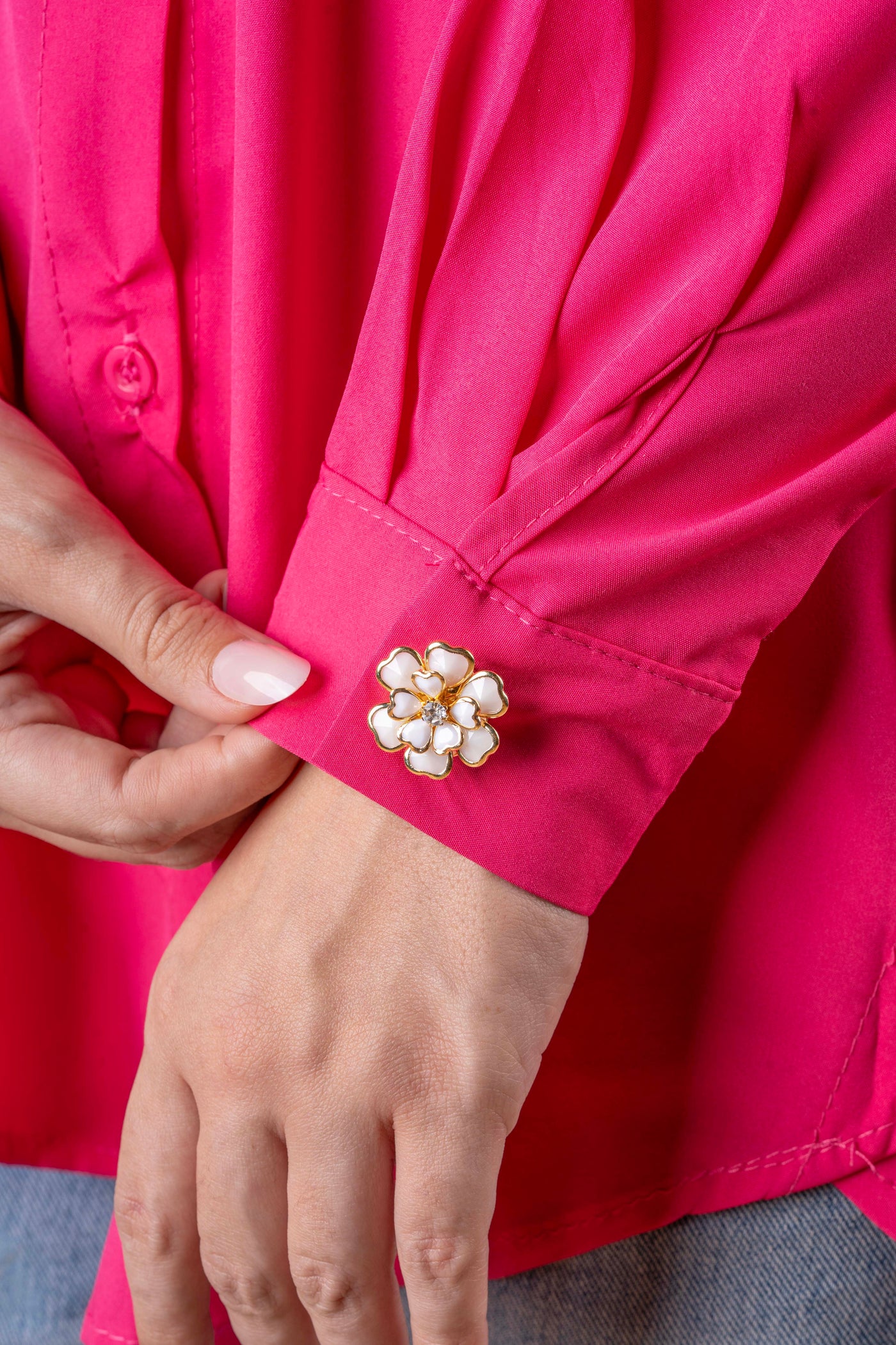 Calista is a sculpted floral button cover adorned with vibrant white-toned crystal petals and finished with a luminous center accent. Framed in polished gold-tone detailing, it adds depth, color, and refined elegance to any blouse or shirt.