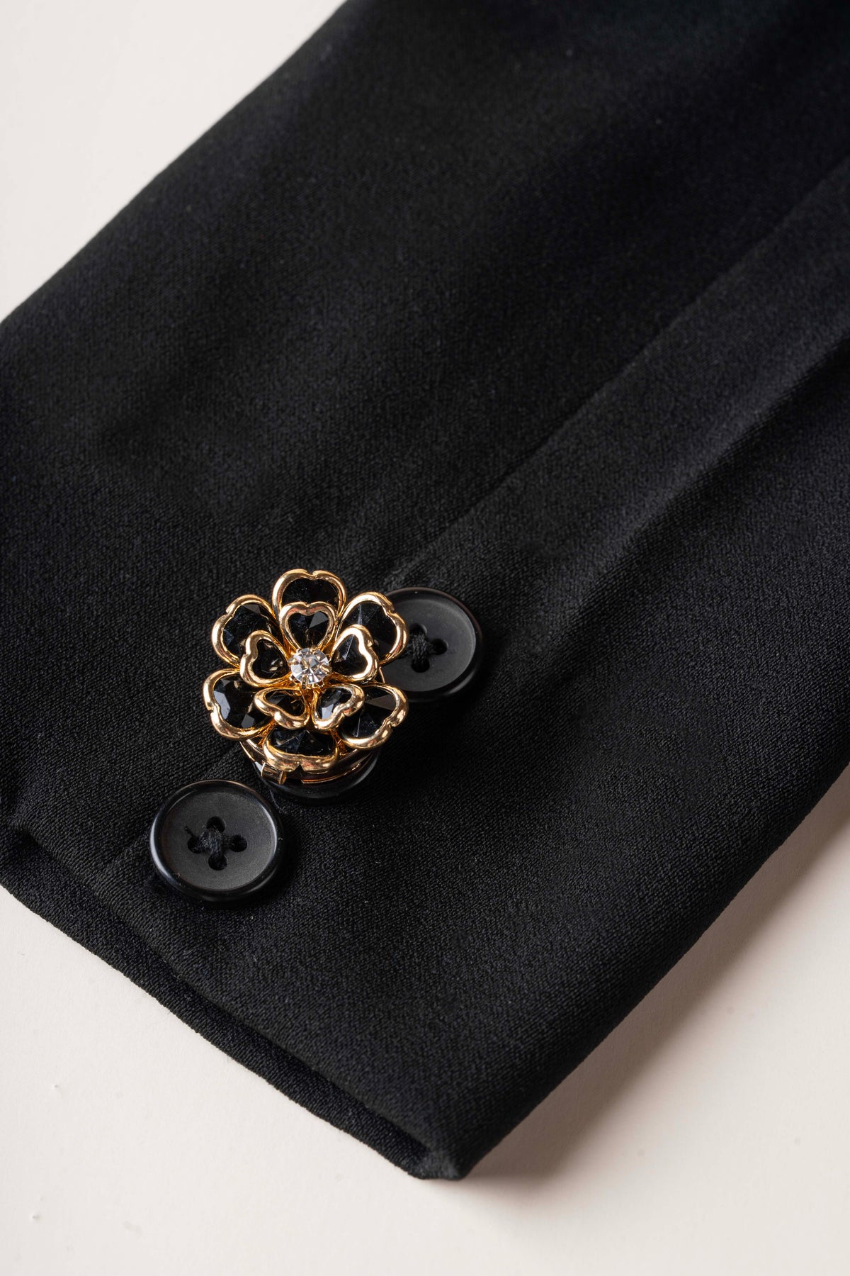 Calista is a sculpted floral button cover adorned with vibrant black-toned crystal petals and finished with a luminous center accent. Framed in polished gold-tone detailing, it adds depth, color, and refined elegance to any blouse or shirt.