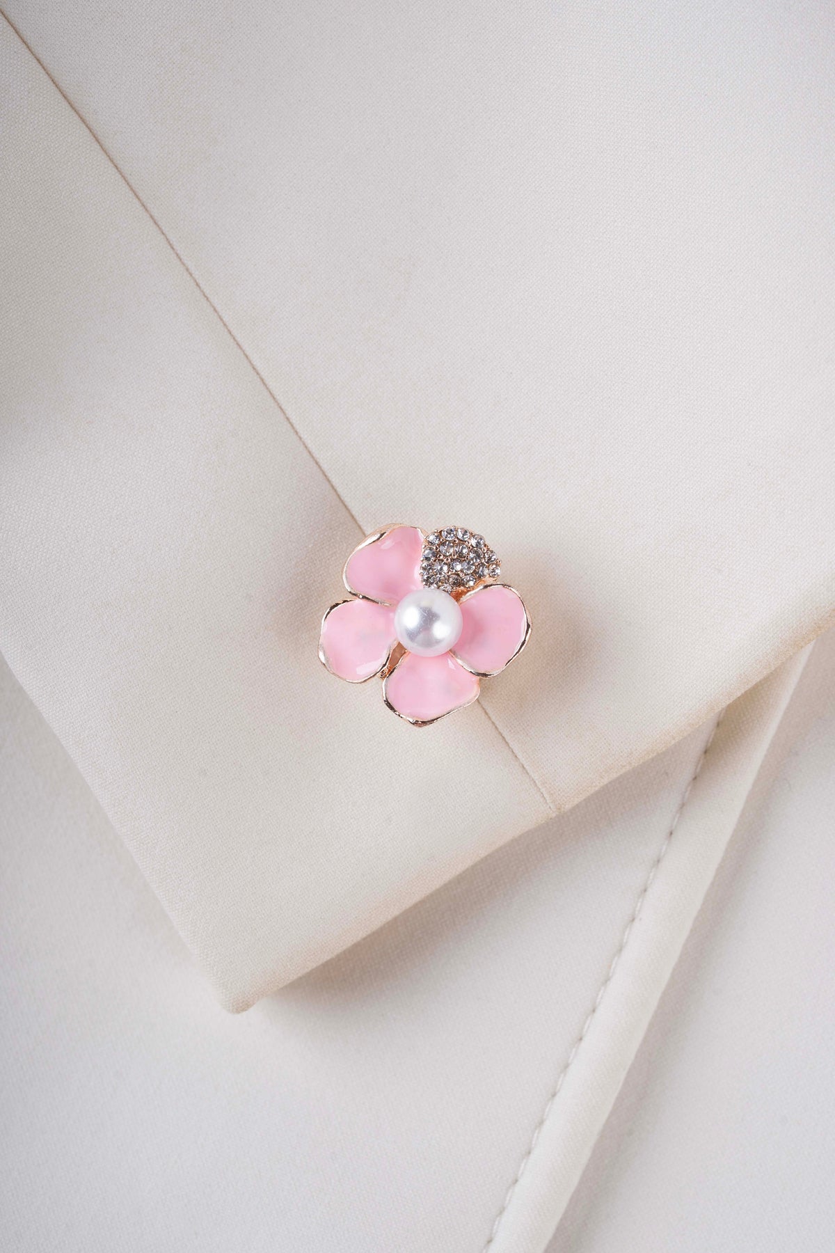 Elowen is a delicately sculpted floral button cover featuring soft blush enamel petals, a luminous pearl center, and subtle crystal detailing. Light and refined, it brings gentle elegance to any blouse or shirt.
