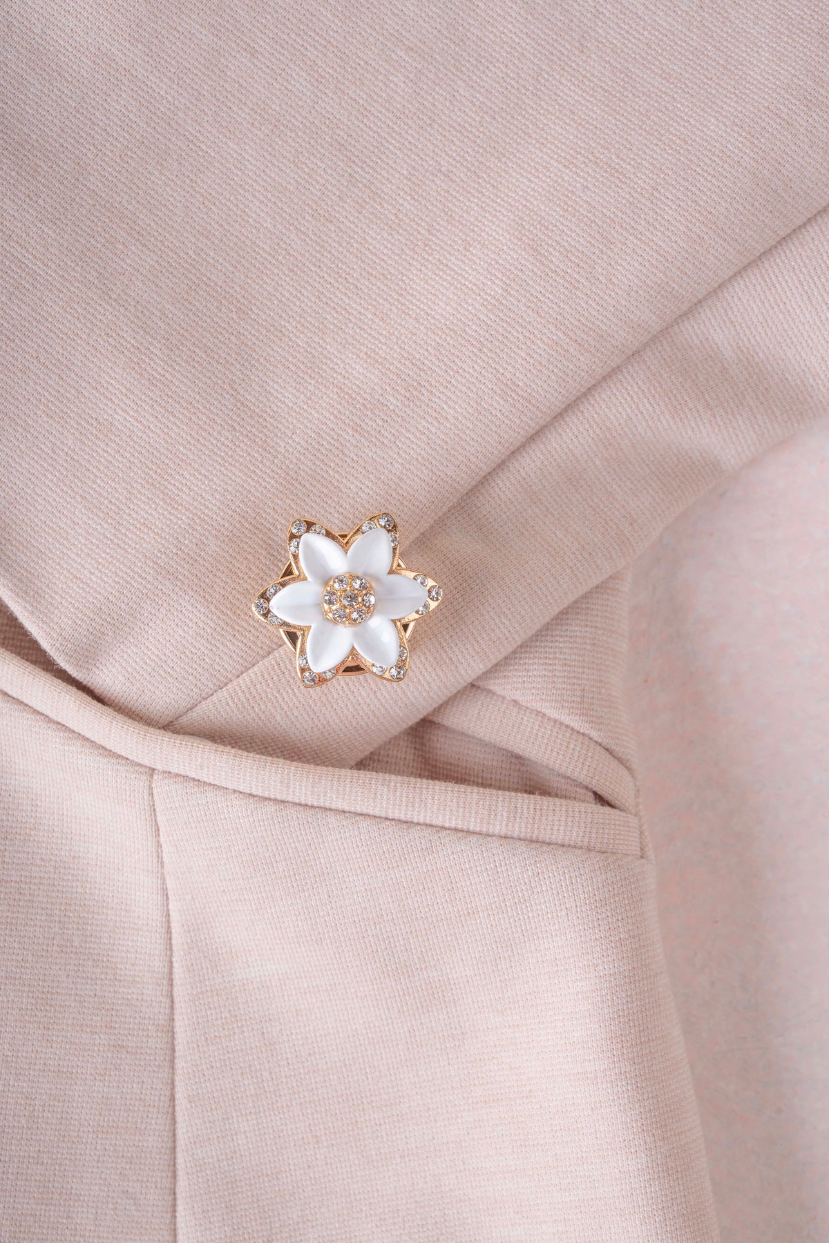 Alessia is a delicately sculpted floral button cover featuring luminous white enamel petals framed in refined gold-tone detailing. Finished with a crystal center and subtle accent stones, it brings light and elegance to any blouse or shirt.