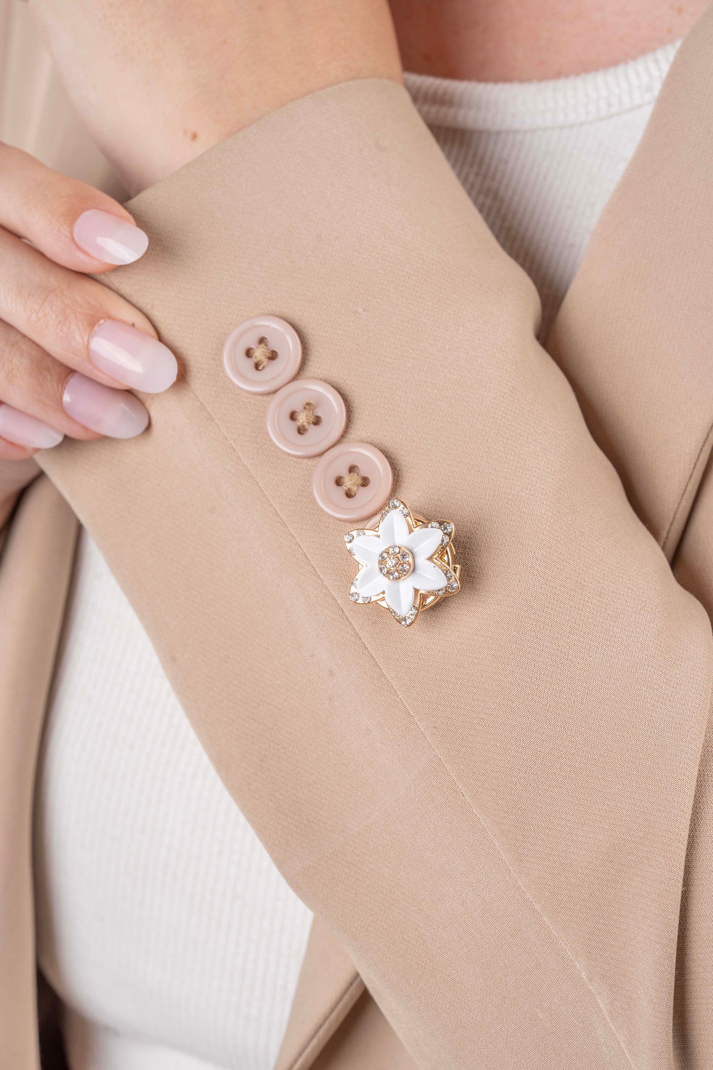 Designed to clip securely over your existing button, Alessia offers a polished finishing touch that feels both graceful and modern — no sewing or alterations required.