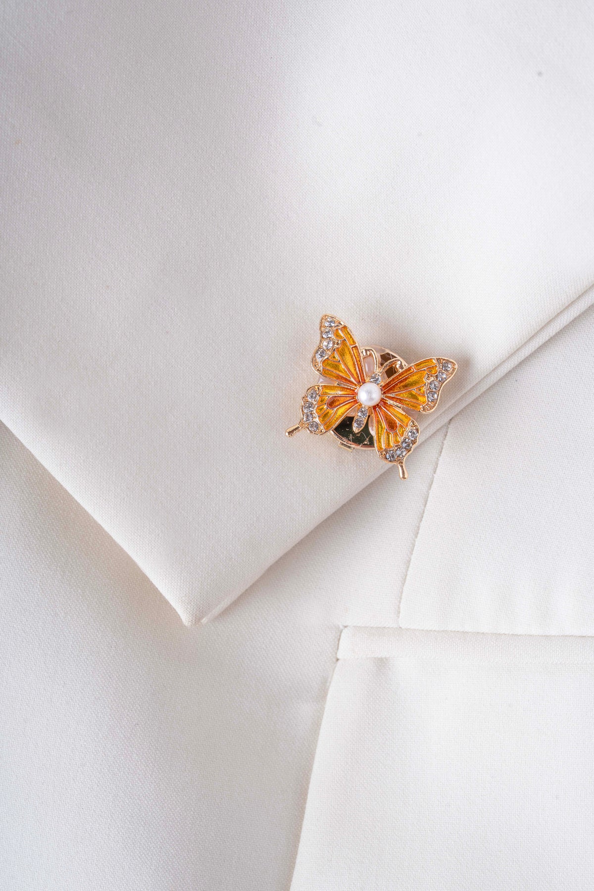 Aureva is a sculpted butterfly button cover adorned with warm amber enamel wings, delicate crystal accents, and a luminous pearl center. Refined yet expressive, it brings graceful movement and subtle radiance to any blouse or shirt.