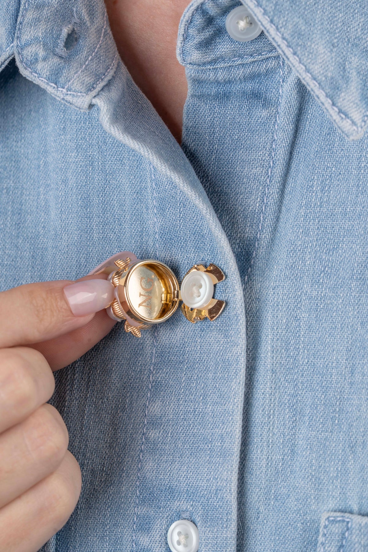 Designed to clip securely over your existing button, Rosaline adds a polished finishing touch with effortless sophistication — no sewing or alterations required.