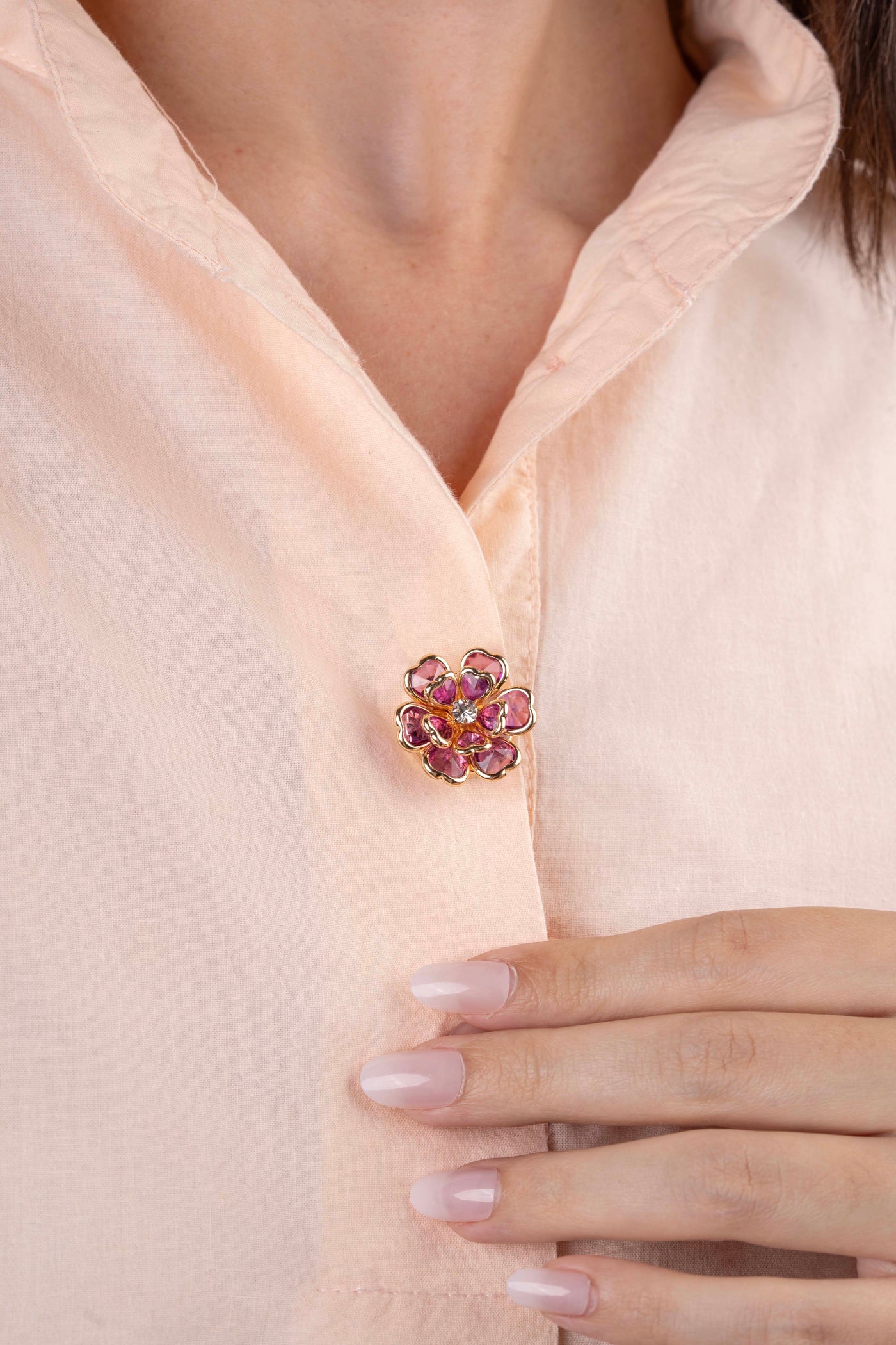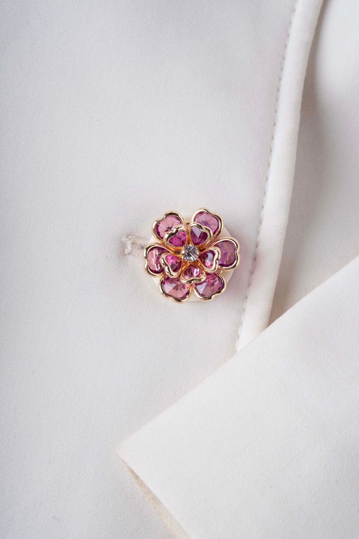 Calista is a sculpted floral button cover adorned with vibrant rose-toned crystal petals and finished with a luminous center accent. Framed in polished gold-tone detailing, it adds depth, color, and refined elegance to any blouse or shirt.