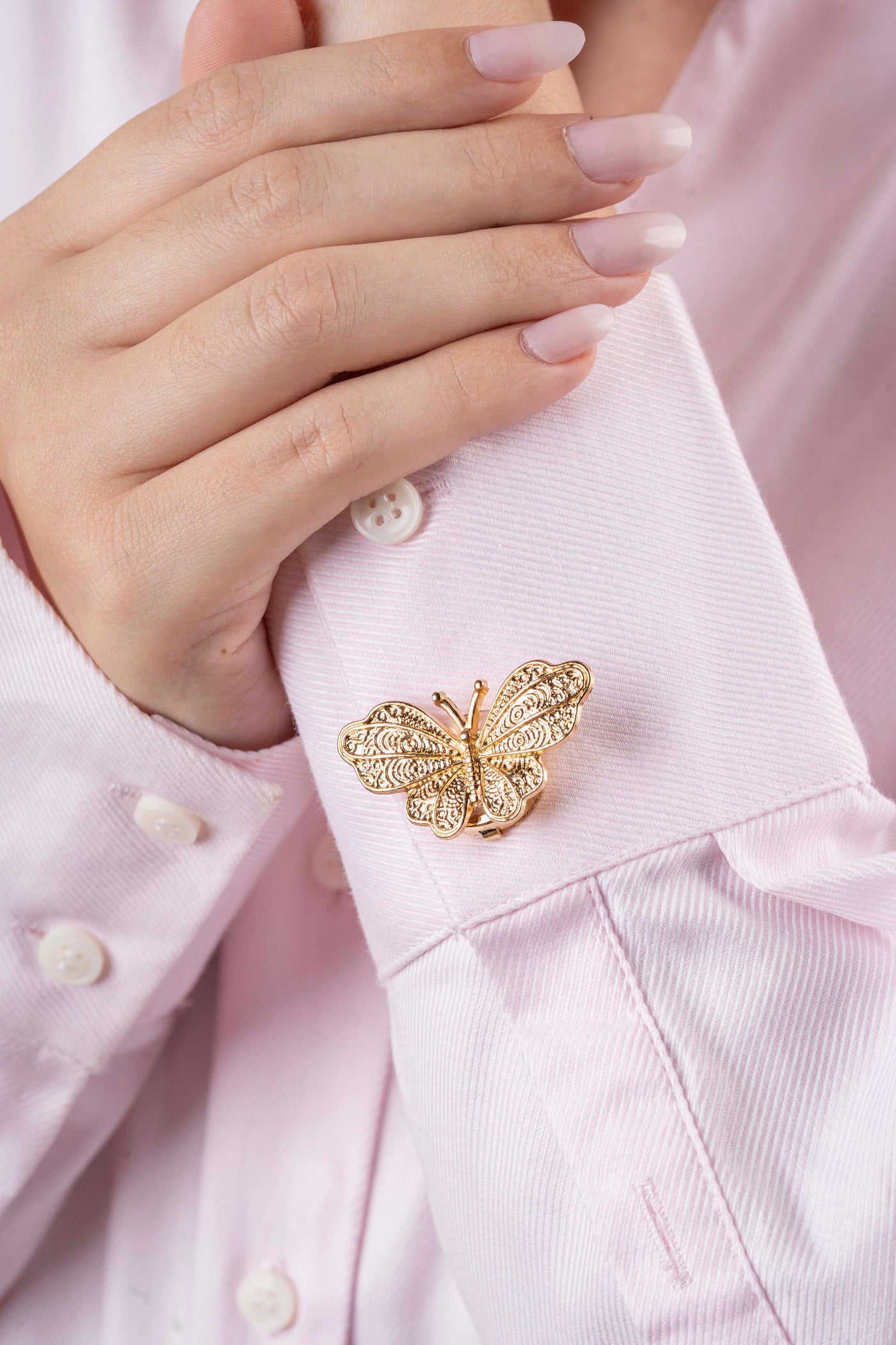 Seraphiel is a finely sculpted butterfly button cover crafted in intricate gold-tone filigree. Light yet detailed, its airy silhouette brings refined artistry and quiet sophistication to any blouse or shirt.