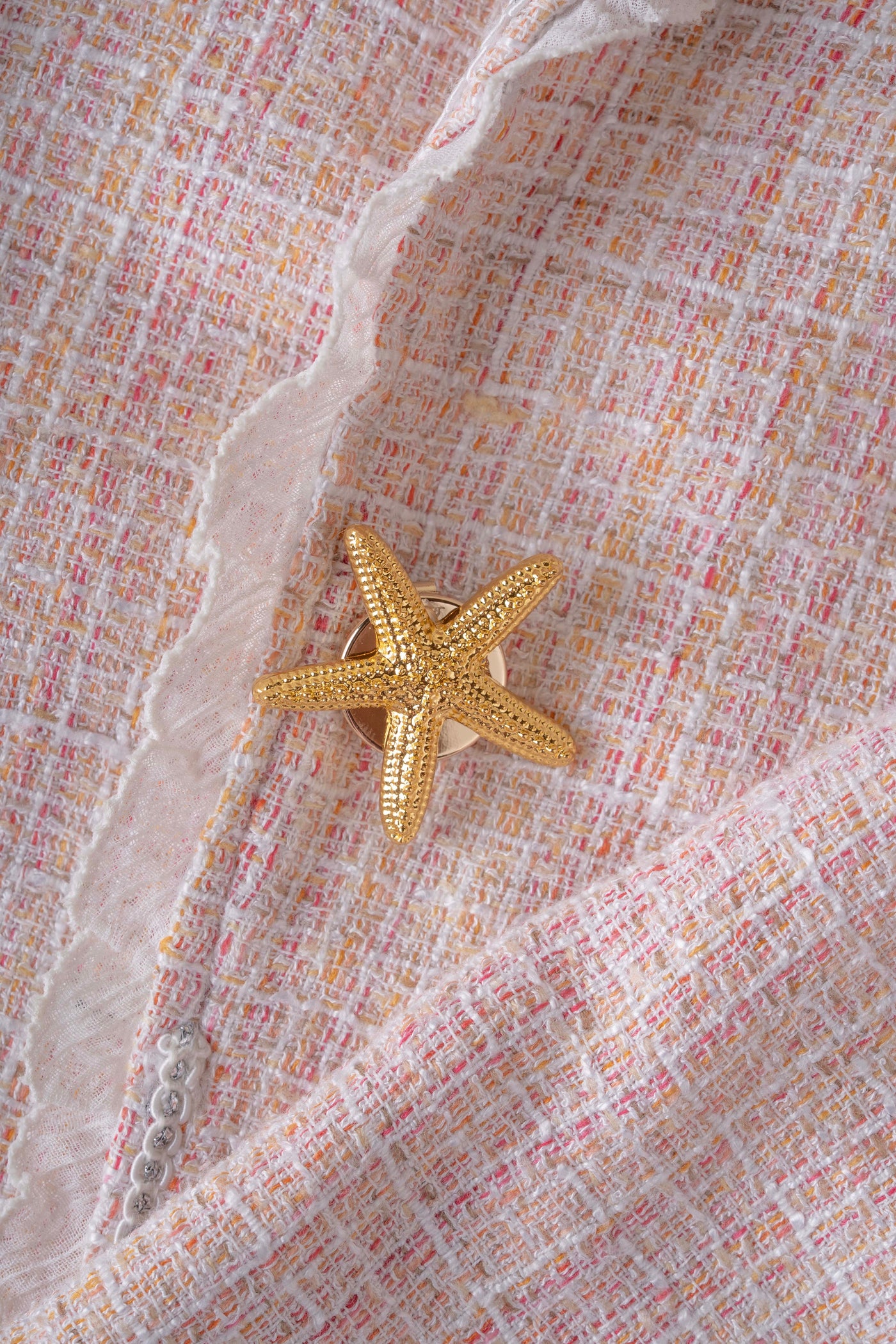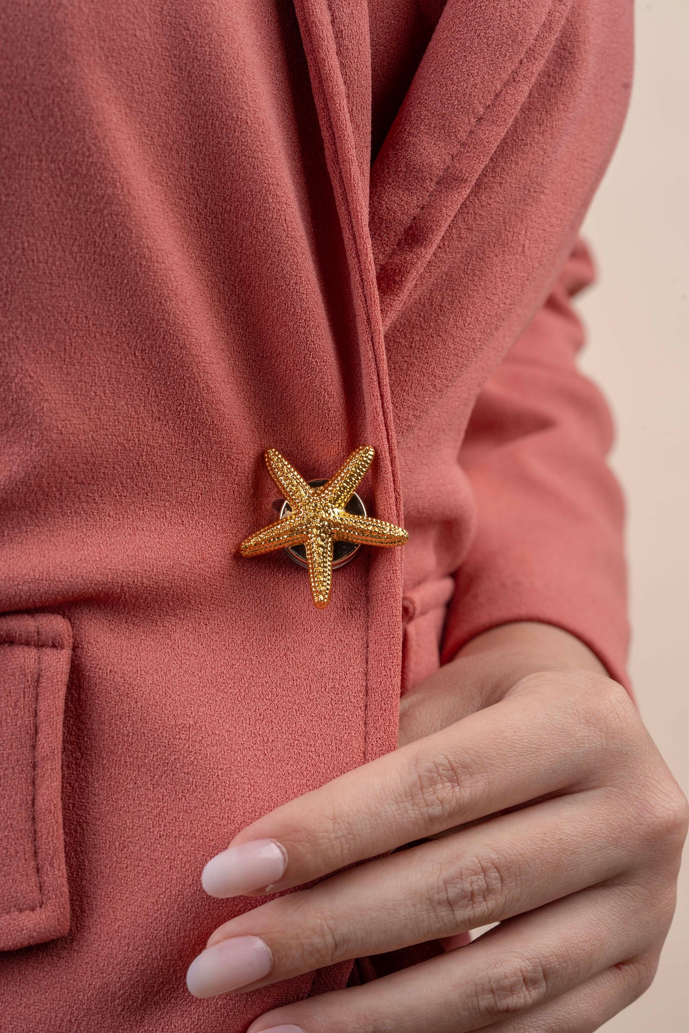 Marea is a sculptural starfish-inspired button cover crafted in textured gold-tone metal. Bold yet refined, its dimensional silhouette captures light beautifully and brings a touch of elevated coastal sophistication to any blouse or shirt.