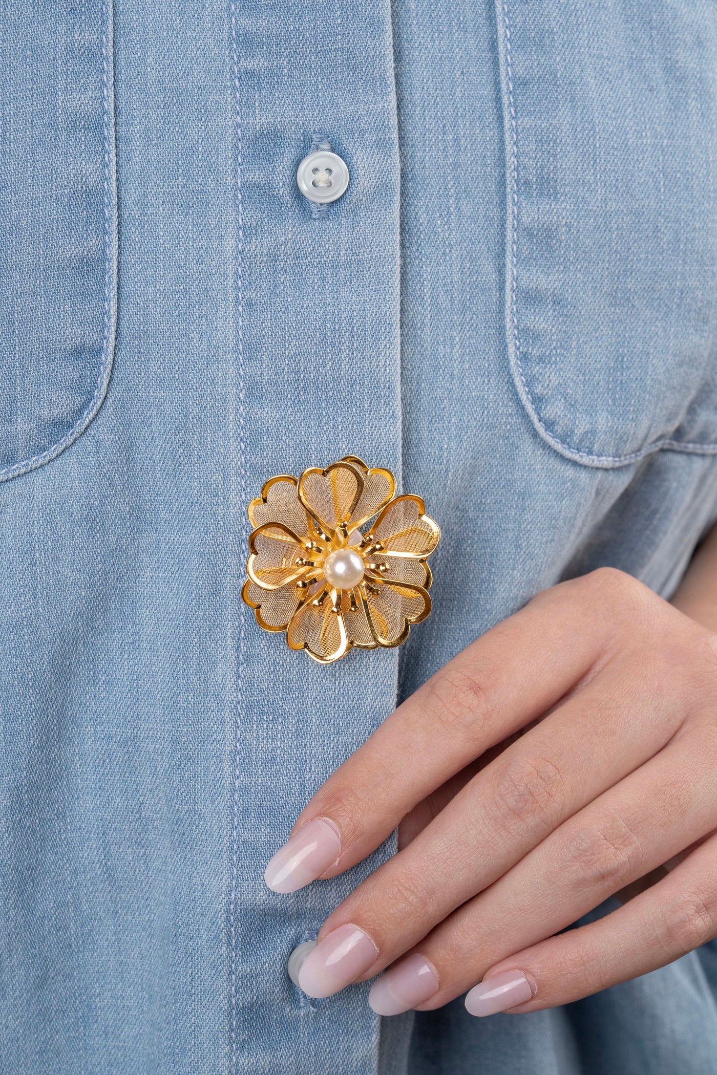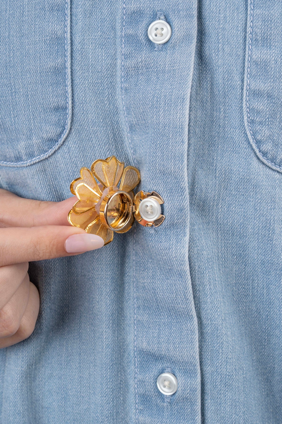 Aurielle is a statement floral button cover defined by its layered gold-tone petals and luminous pearl center. Bold yet refined, its sculptural design captures light beautifully and adds elevated elegance to any blouse or shirt.
