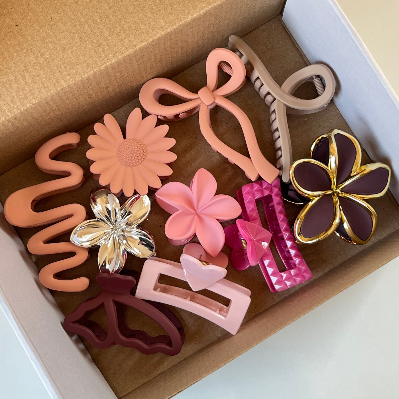A trendy peach rose floral hair claw combo featuring assorted flower and abstract shapes in warm peach, blush pink, and deep wine tones. Designed to create a stylish and coordinated look while maintaining a cohesive floral theme throughout the combo.