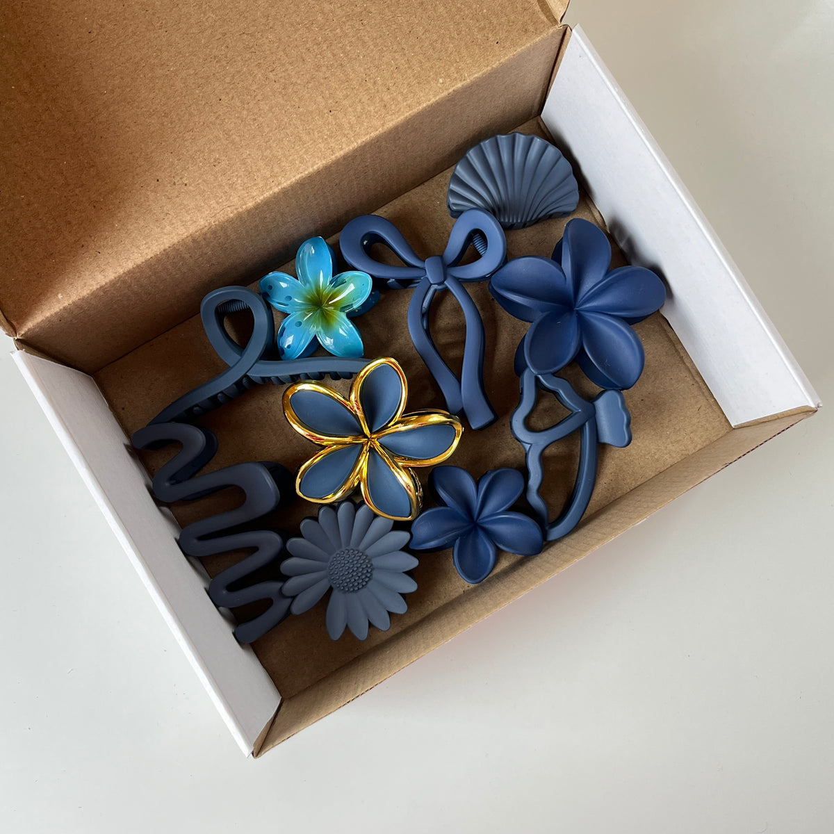 A bold and elegant combo of floral hair claw clips in deep midnight blue and cool slate tones. This curated set features matte florals, glossy gradient petals, metallic gold-outlined flower accents, bow shapes, abstract curves, shell-inspired designs, and heart details — all thoughtfully coordinated to maintain a cohesive floral theme.