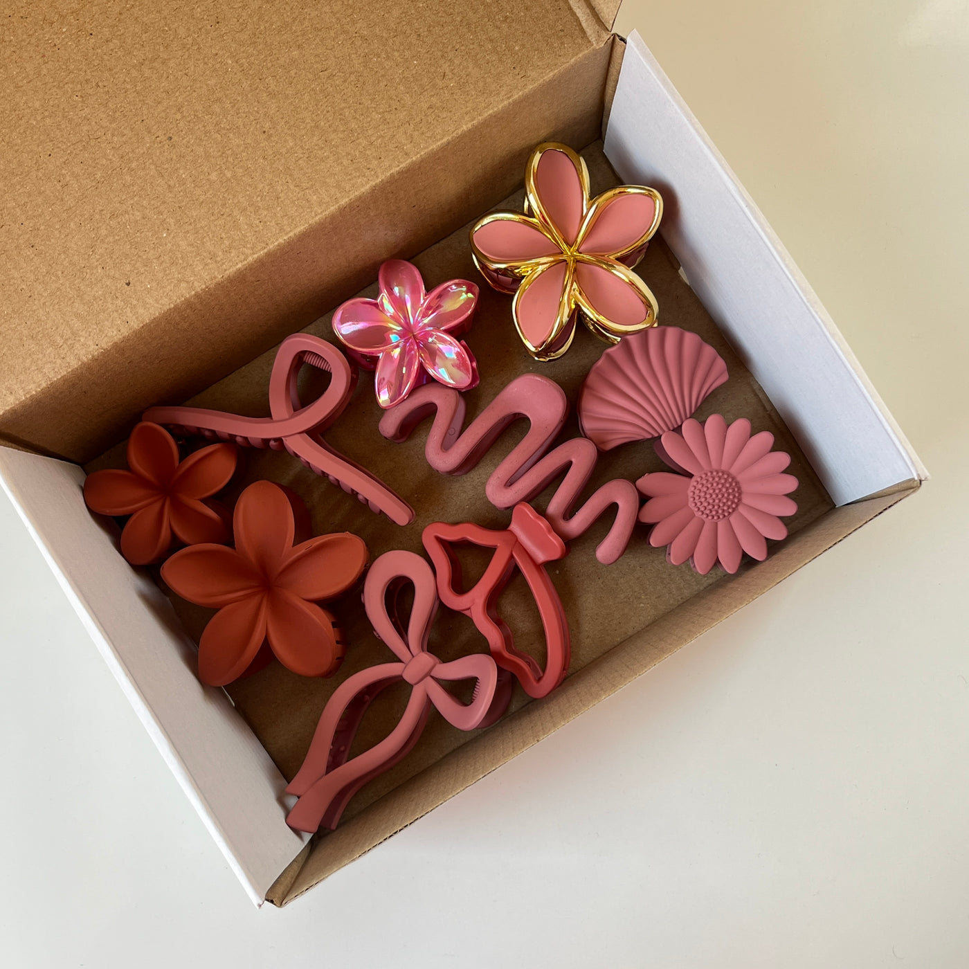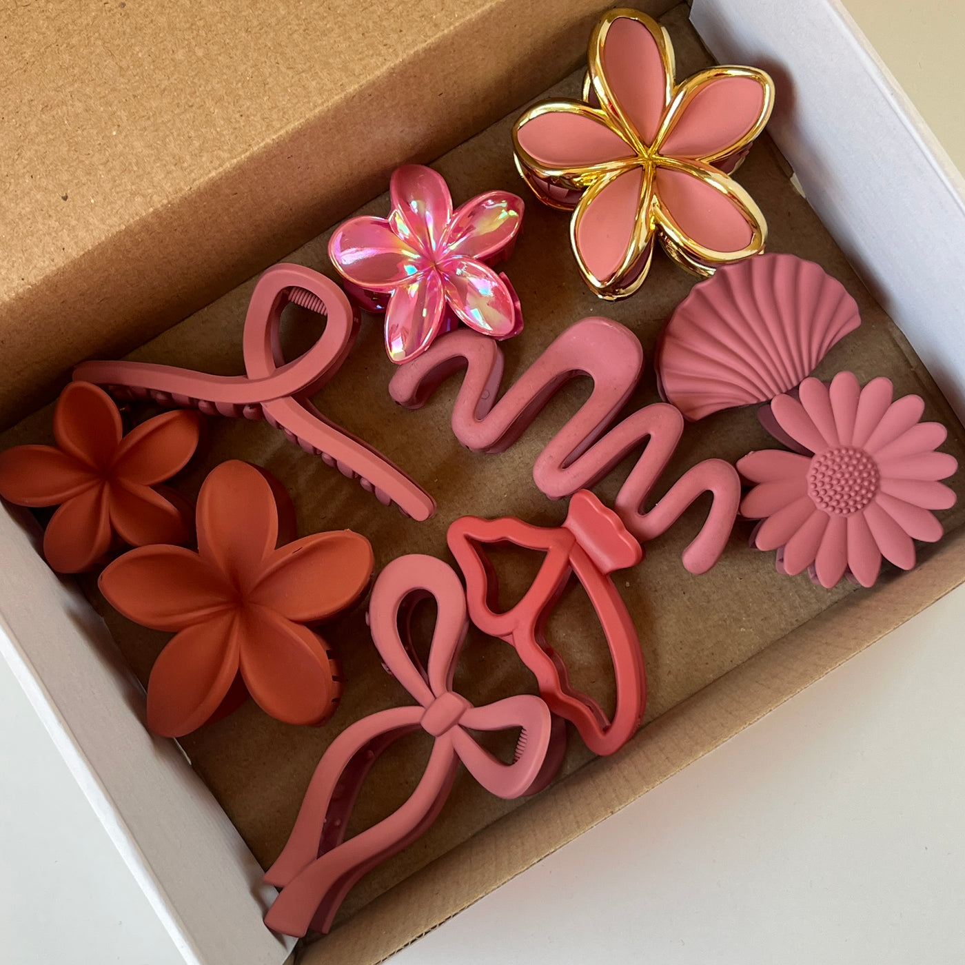 A stylish and feminine combo of floral hair claw clips in rich rose pink and soft blush tones. This curated set features matte florals, glossy petals, metallic gold-outlined flower accents, bow shapes, abstract curves, and shell-inspired designs — all coordinated to maintain a cohesive floral theme.
