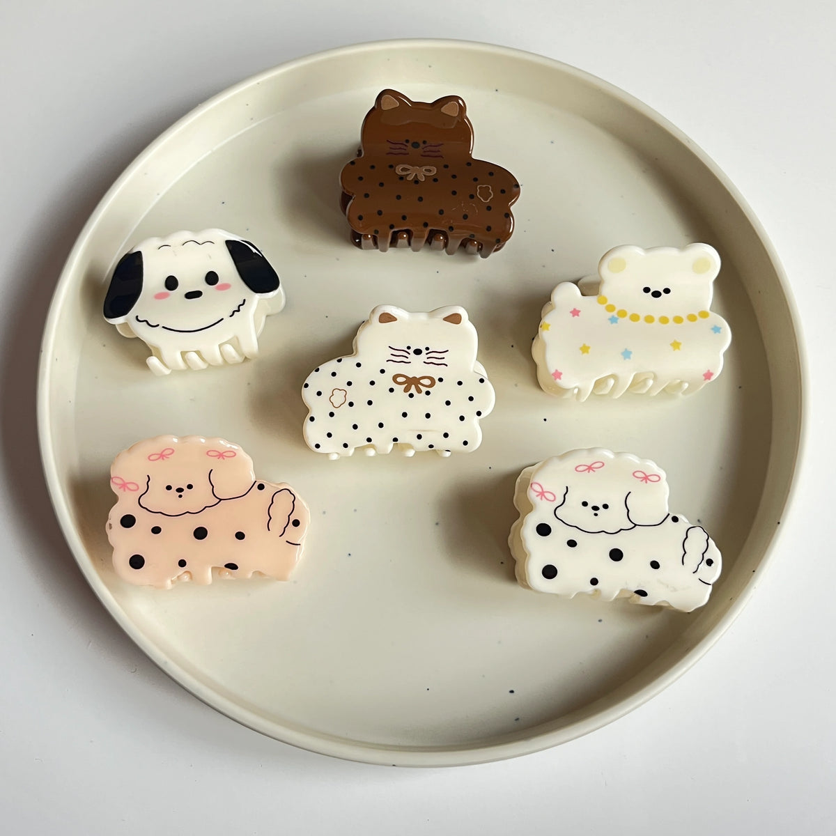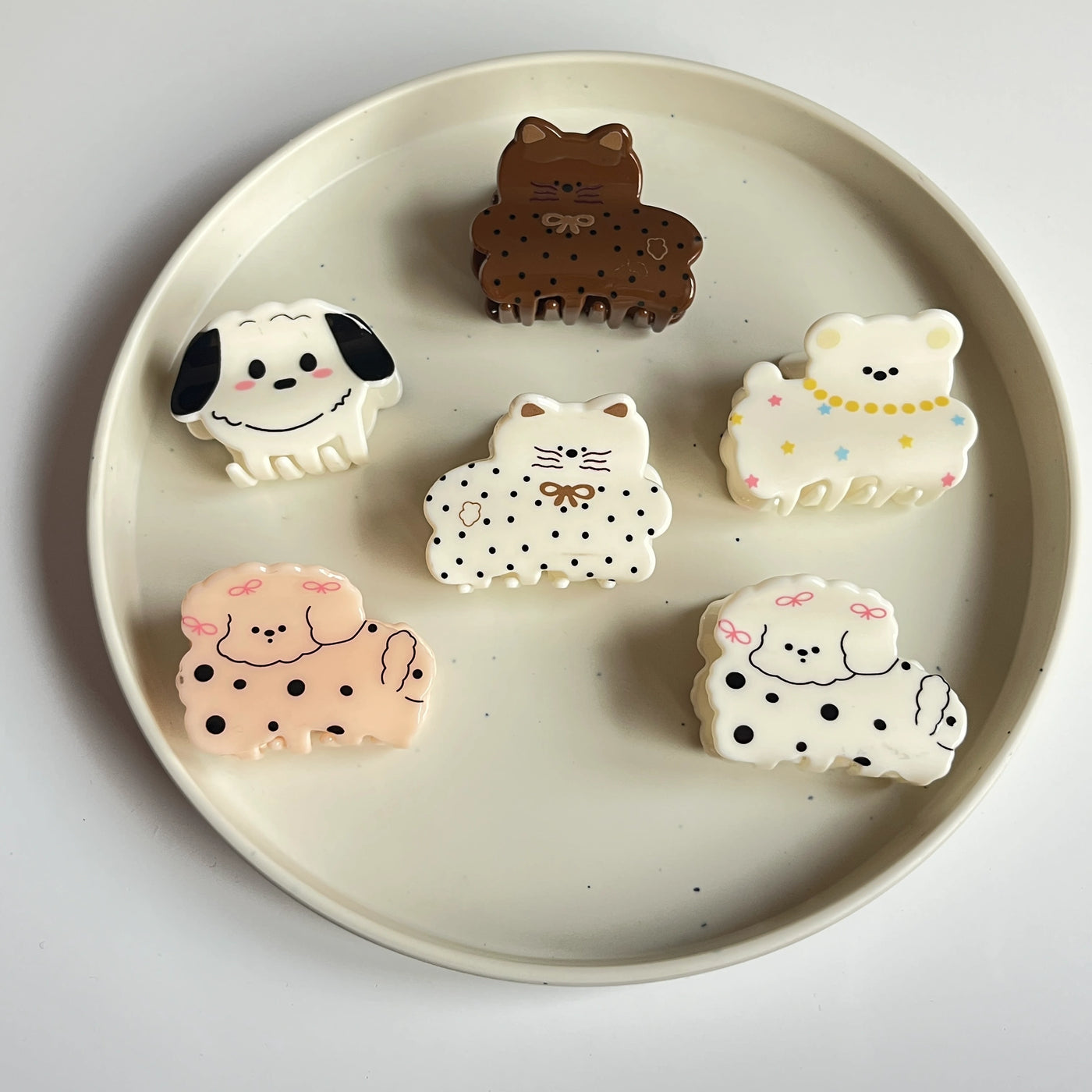 A coordinated set of dog-shaped hair claws featuring varied illustrated designs within a cohesive theme. The assortment offers visual variety while maintaining a consistent overall look. Designed for easy everyday rotation and casual styling options.