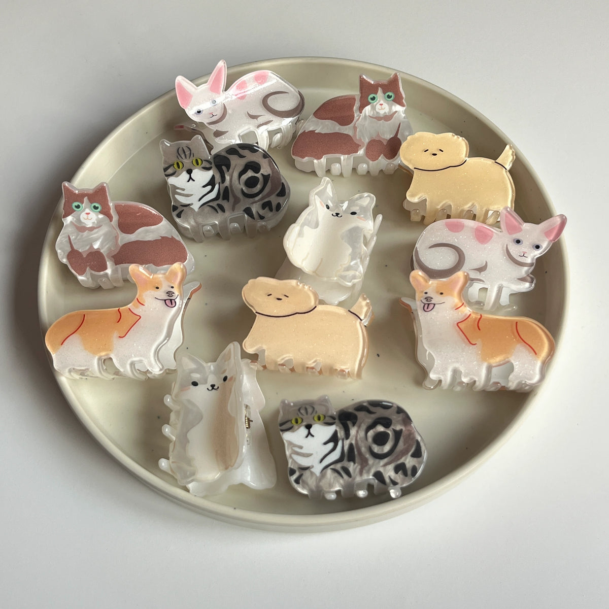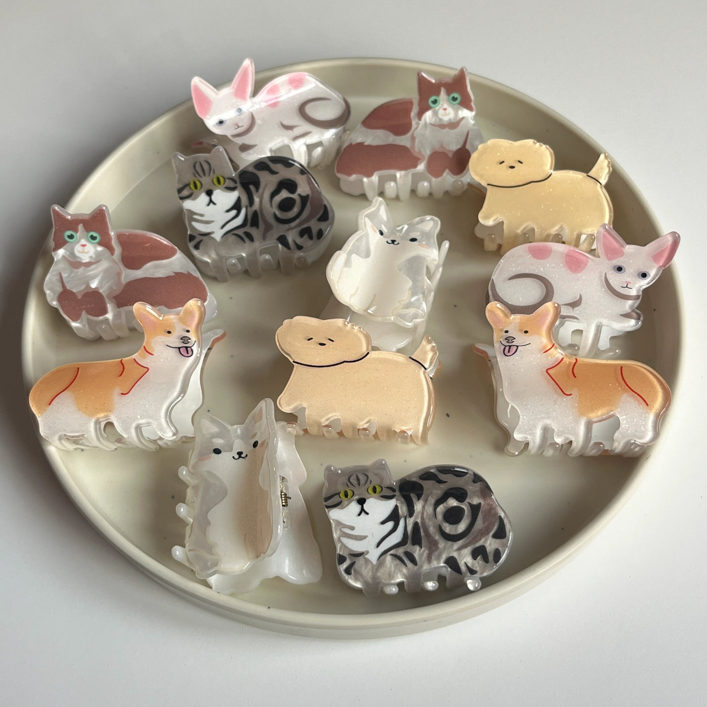 A larger coordinated set of pet-shaped hair claws featuring the same illustrated cat and dog theme in a varied assortment. Some designs may be repeated while maintaining a cohesive overall look. Suitable for daily rotation, sharing, or extended use.