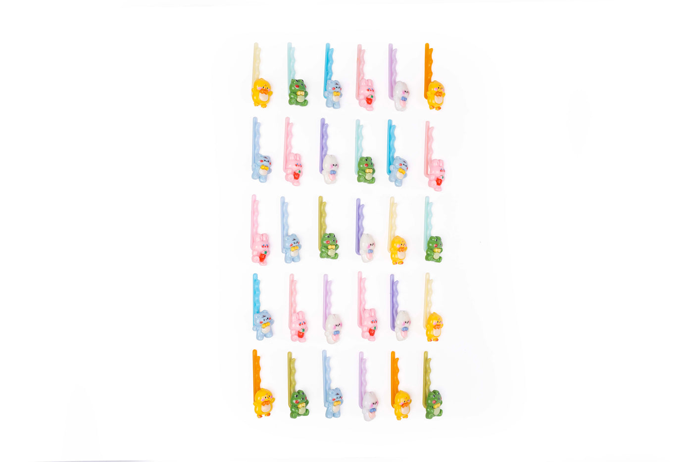 A coordinated full set of fifteen adorable pairs of mini wavy bobby hair pins featuring cute animal characters in soft pastel colours. This set includes charming bunny, bear, frog, and chick designs with glossy detailing for a playful and sweet everyday look.Designed in assorted shades like pink, blue, green, yellow, purple, and peach, this full set keeps the same cute theme while offering a balanced mix of colours and characters.