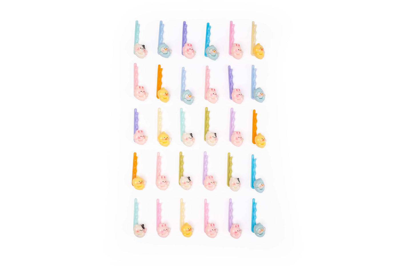 A coordinated full set of twelve adorable pairs of mini bobby hair pins featuring cute farm animal faces including piglet, duckling, sheep, and chick designs. Made in soft pastel shades with a smooth glossy finish, these pins add a fun and charming touch to everyday hairstyles.