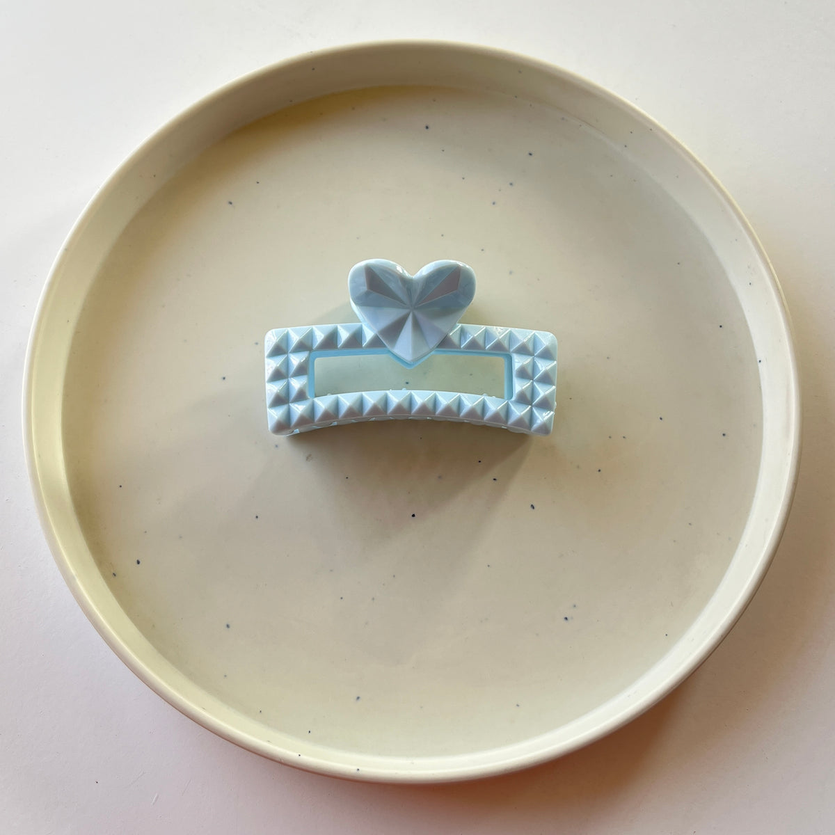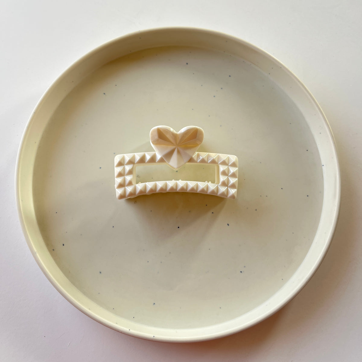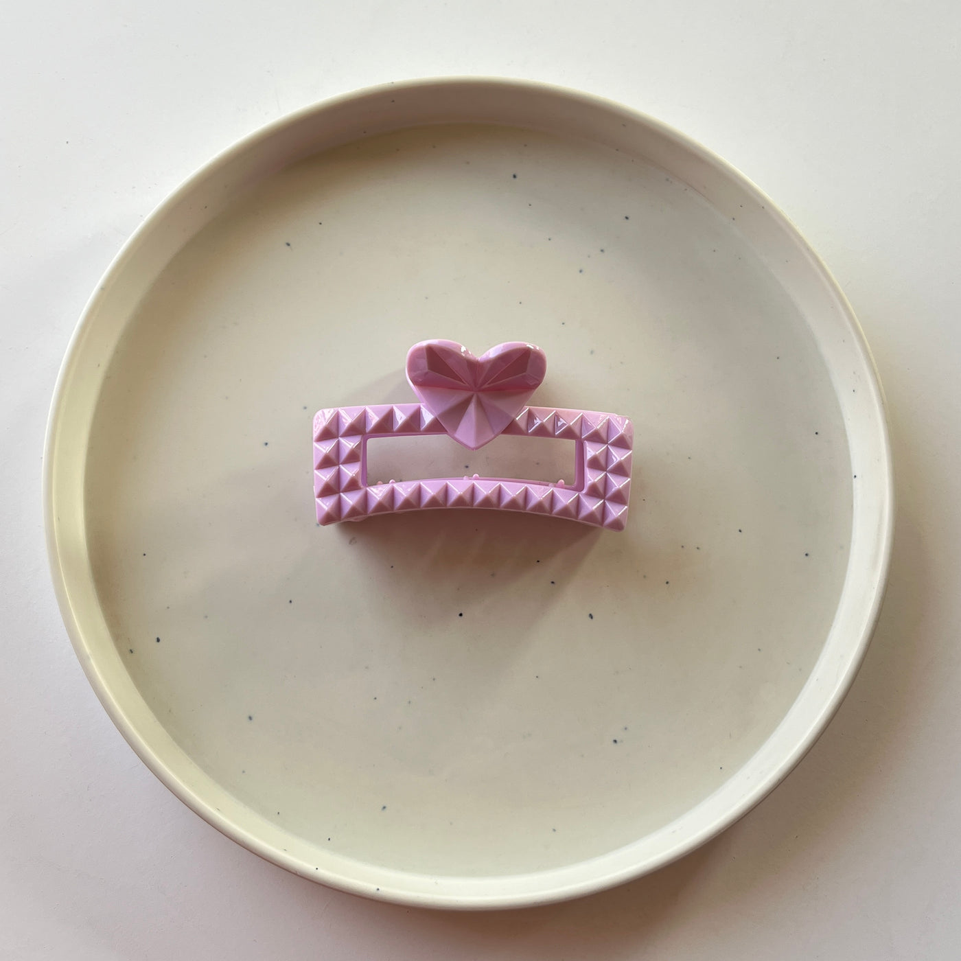 A structured bar-style hair claw featuring a raised heart accent and a studded frame texture. Designed to hold hair securely while maintaining a clean and balanced look. Comfortable for daily wear, it works well with casual styling and neat updos.