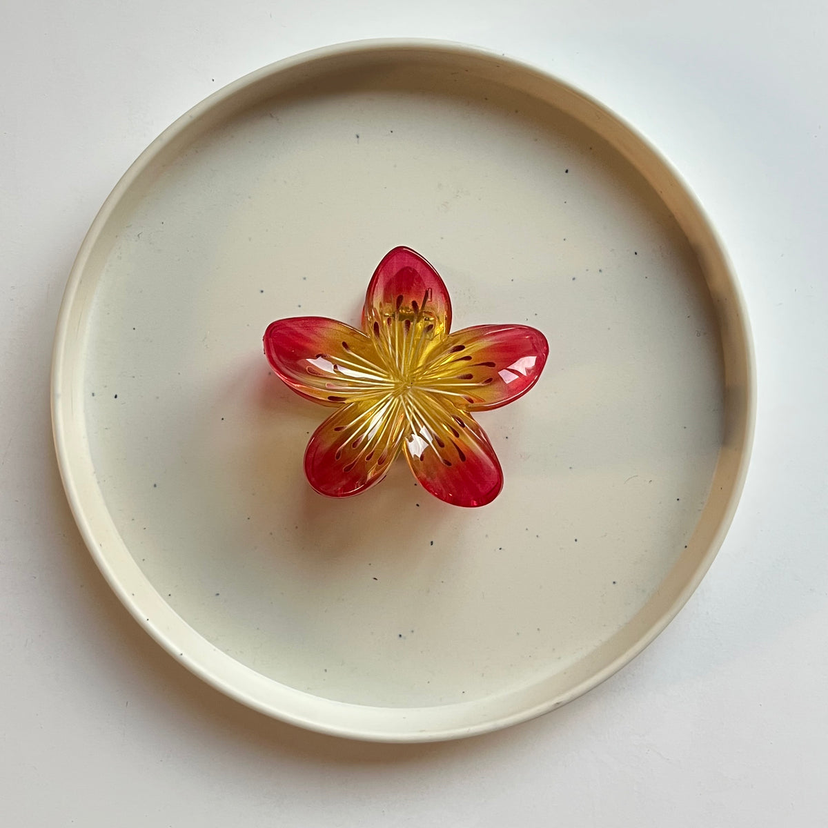 A vibrant floral hair claw featuring translucent petals detailed with fine radiating accents and subtle colour gradients. Designed to add a bold, playful statement while keeping the floral form elegant and eye-catching.