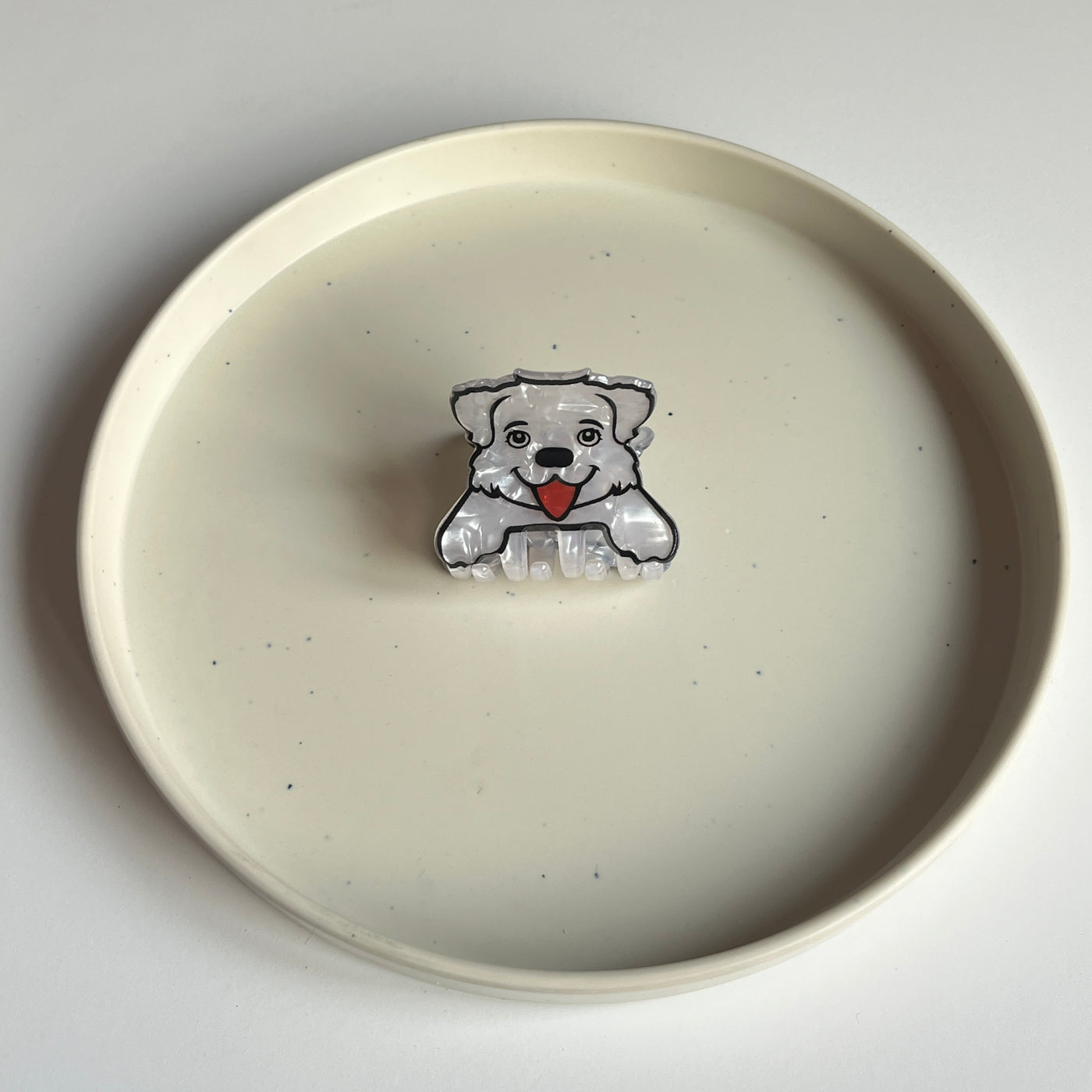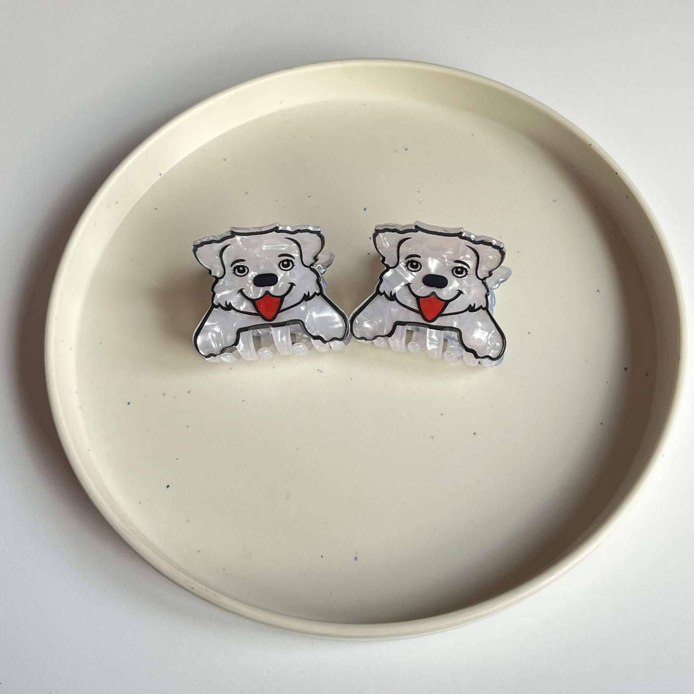 A white dog face hair claw with a smooth sculpted outline and simple illustrated features. Easy to wear throughout the day, it rests neatly in the hair. Designed for everyday and casual styling.