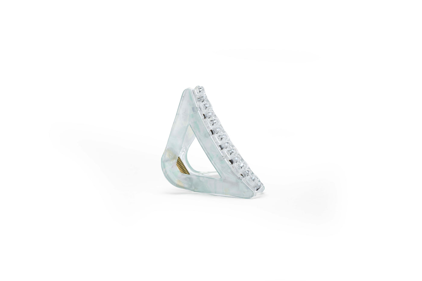 A modern triangular hair claw designed with a sleek open-frame silhouette and a glossy iridescent translucent finish. Crafted in a comfortable medium size, it provides a secure hold while adding a soft, elegant glow to everyday hairstyles.