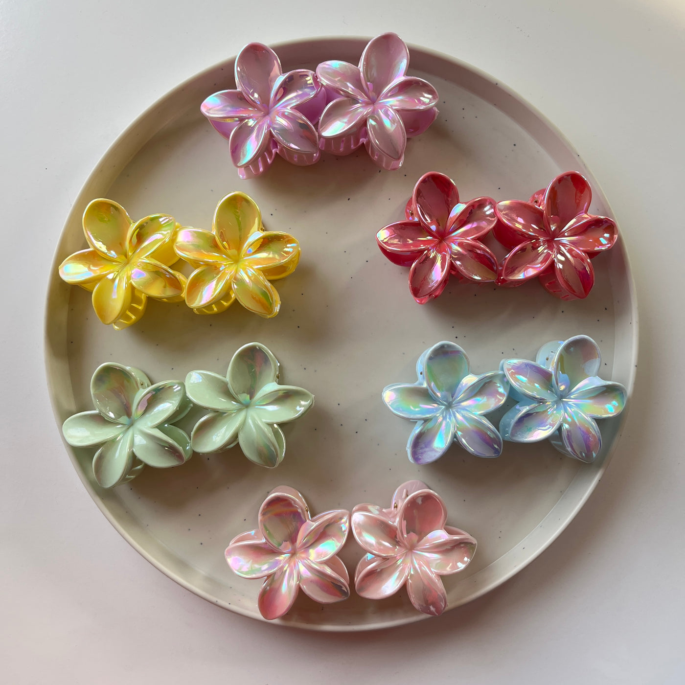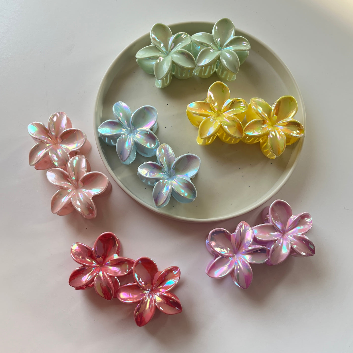 A larger set of flower-shaped hair claws built around the same iridescent design, with colours repeated across the set. Suitable for daily rotation or shared use, it keeps styling consistent while offering added quantity.