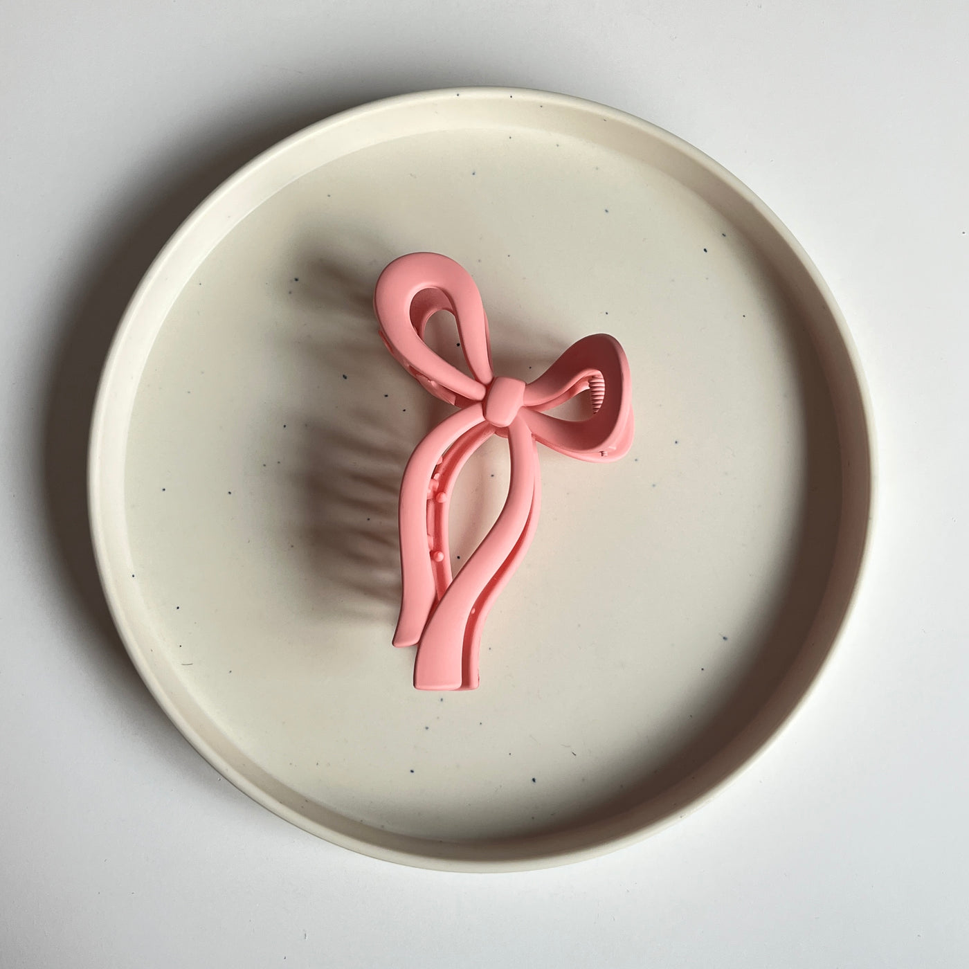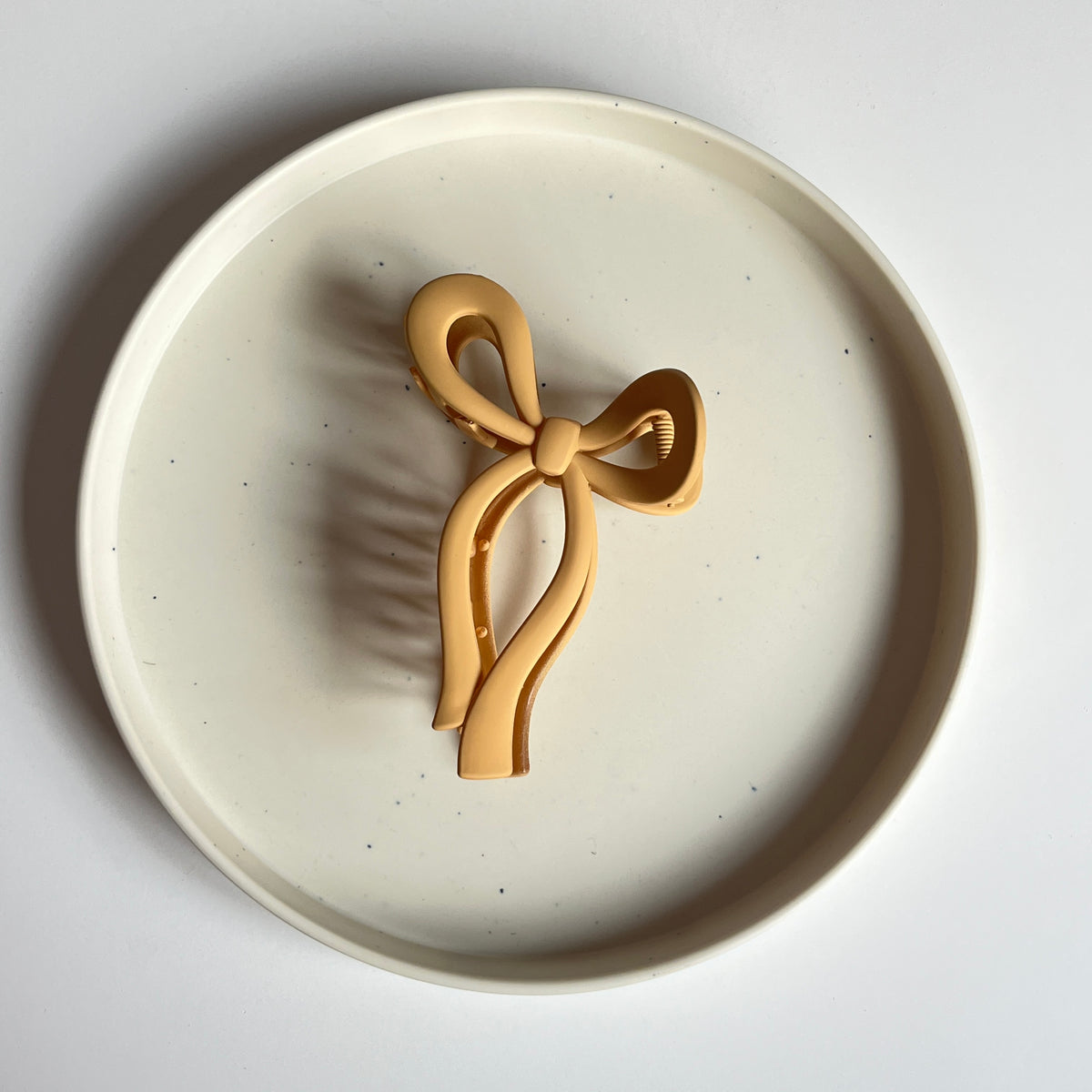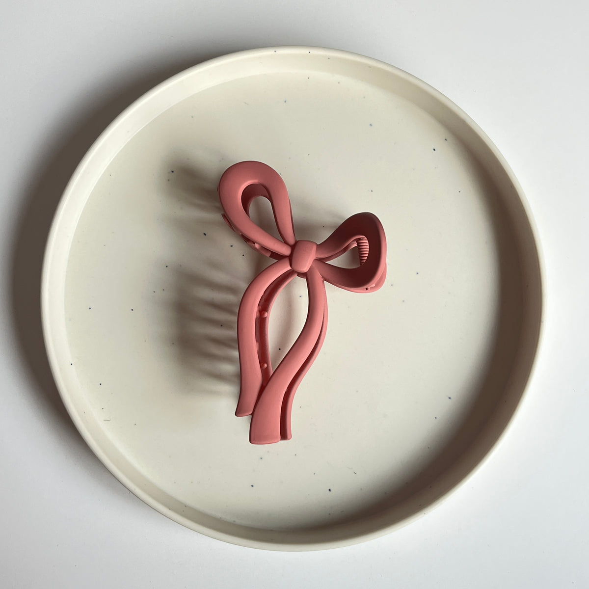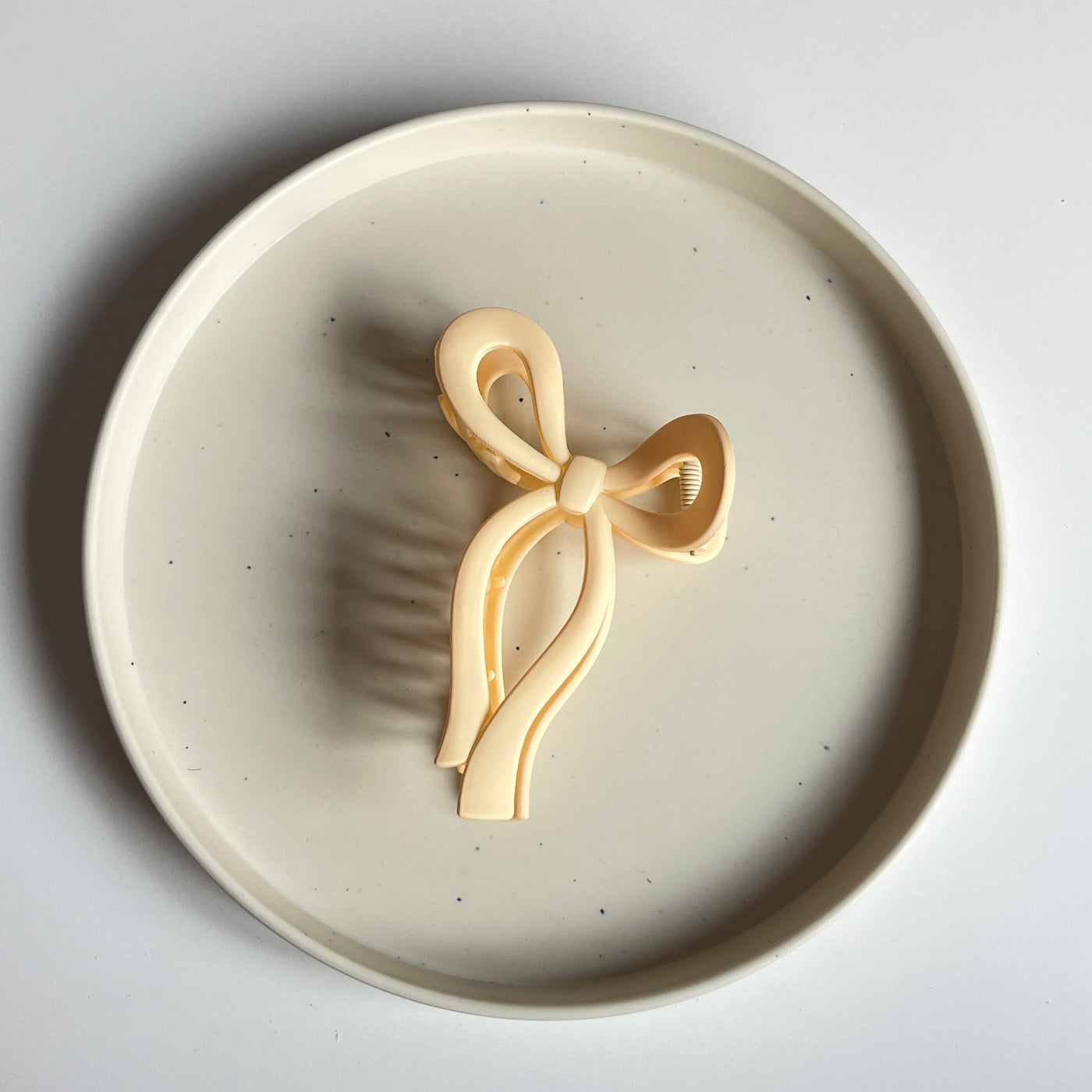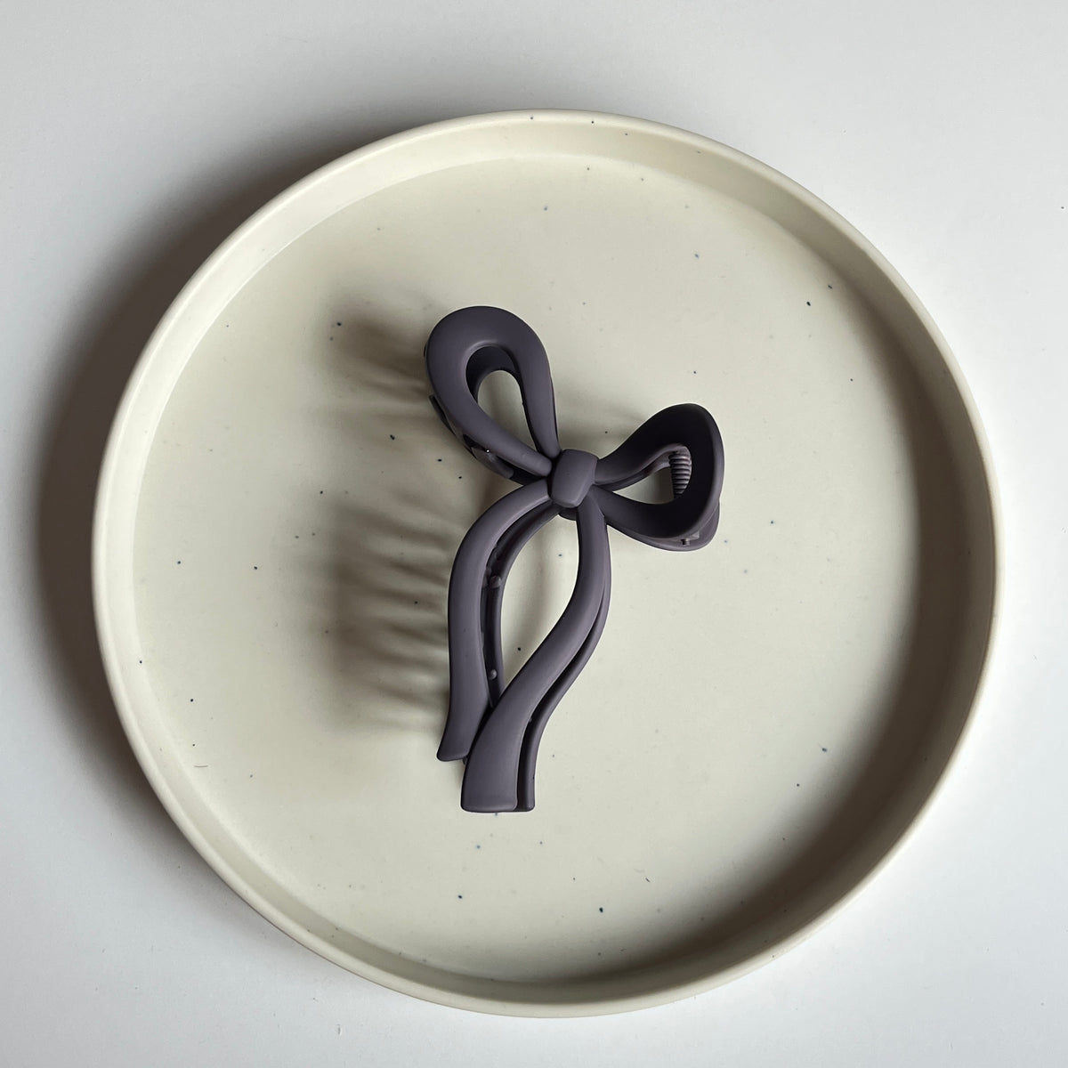 A soft matte bow-shaped claw that adds a cute yet minimal touch to any hairstyle.