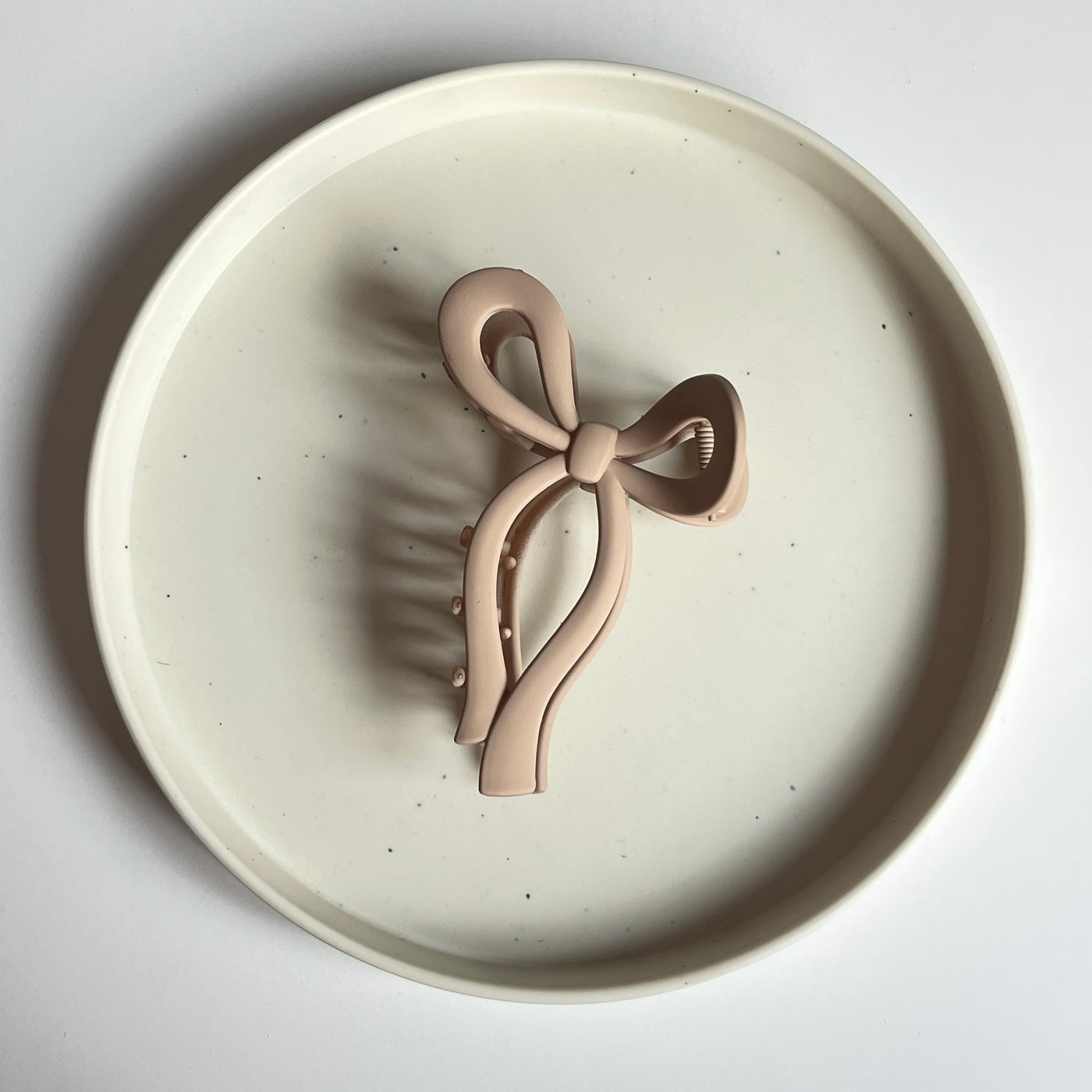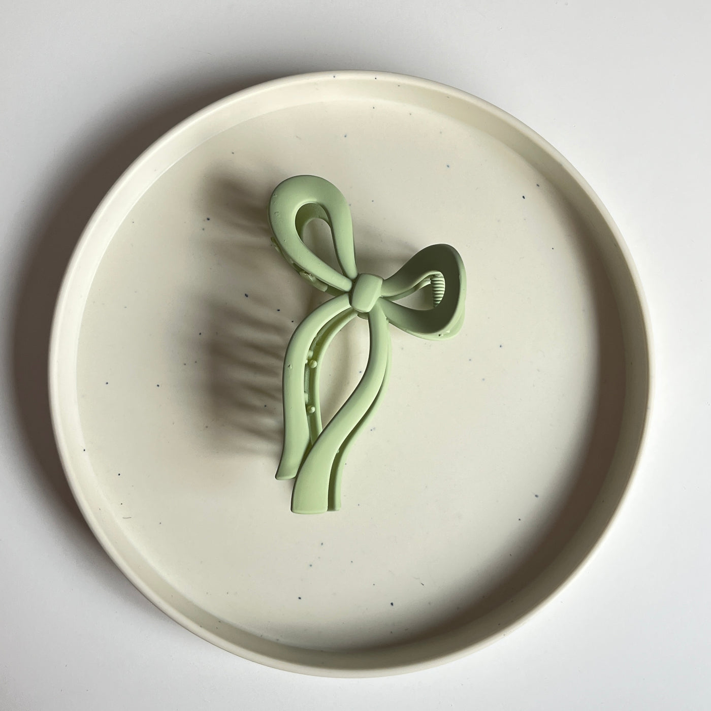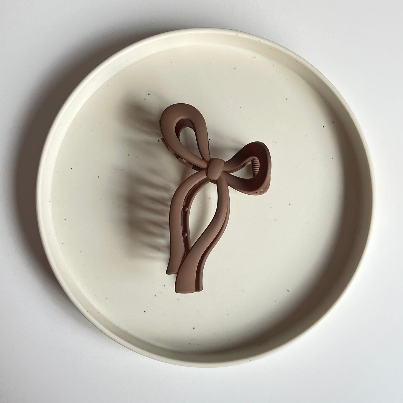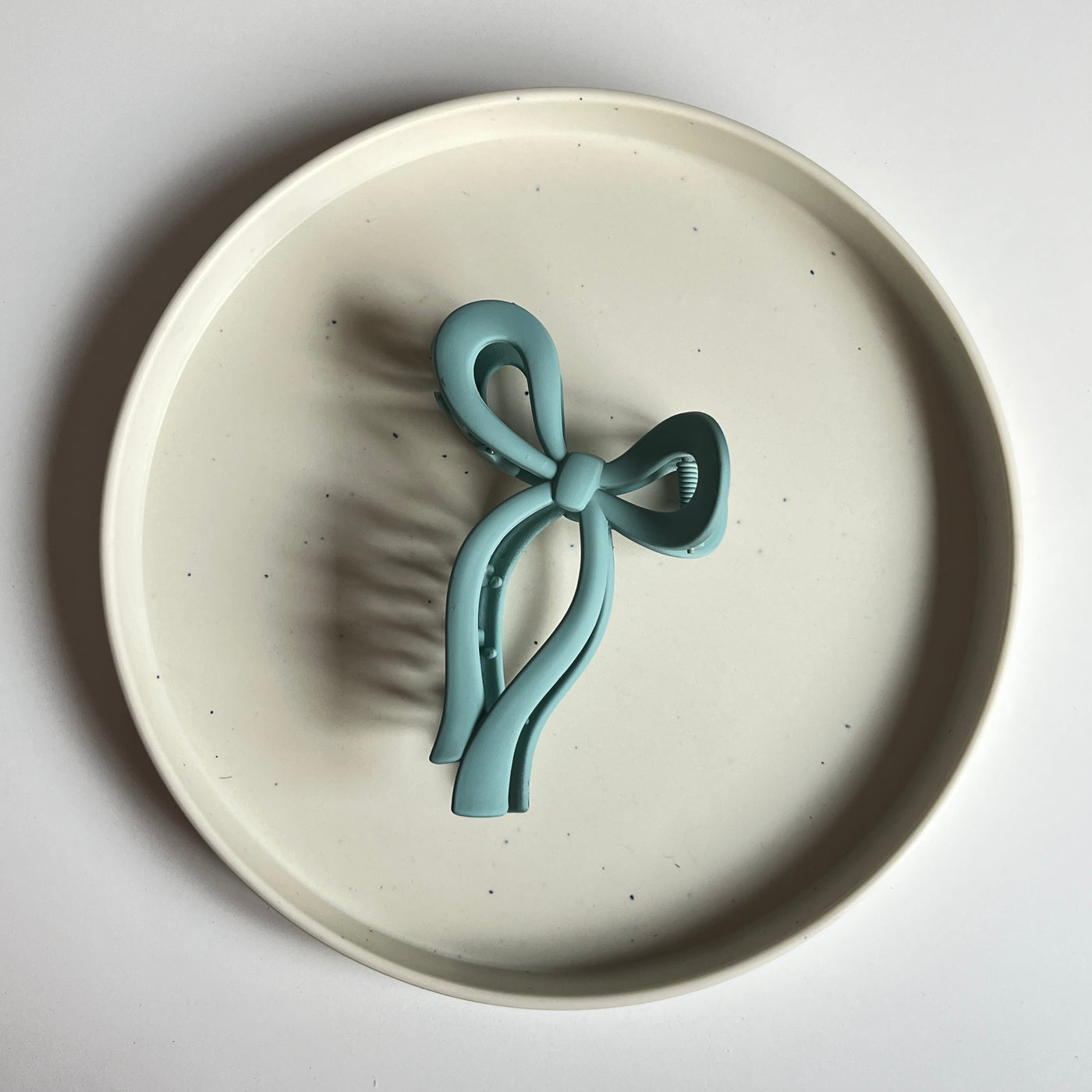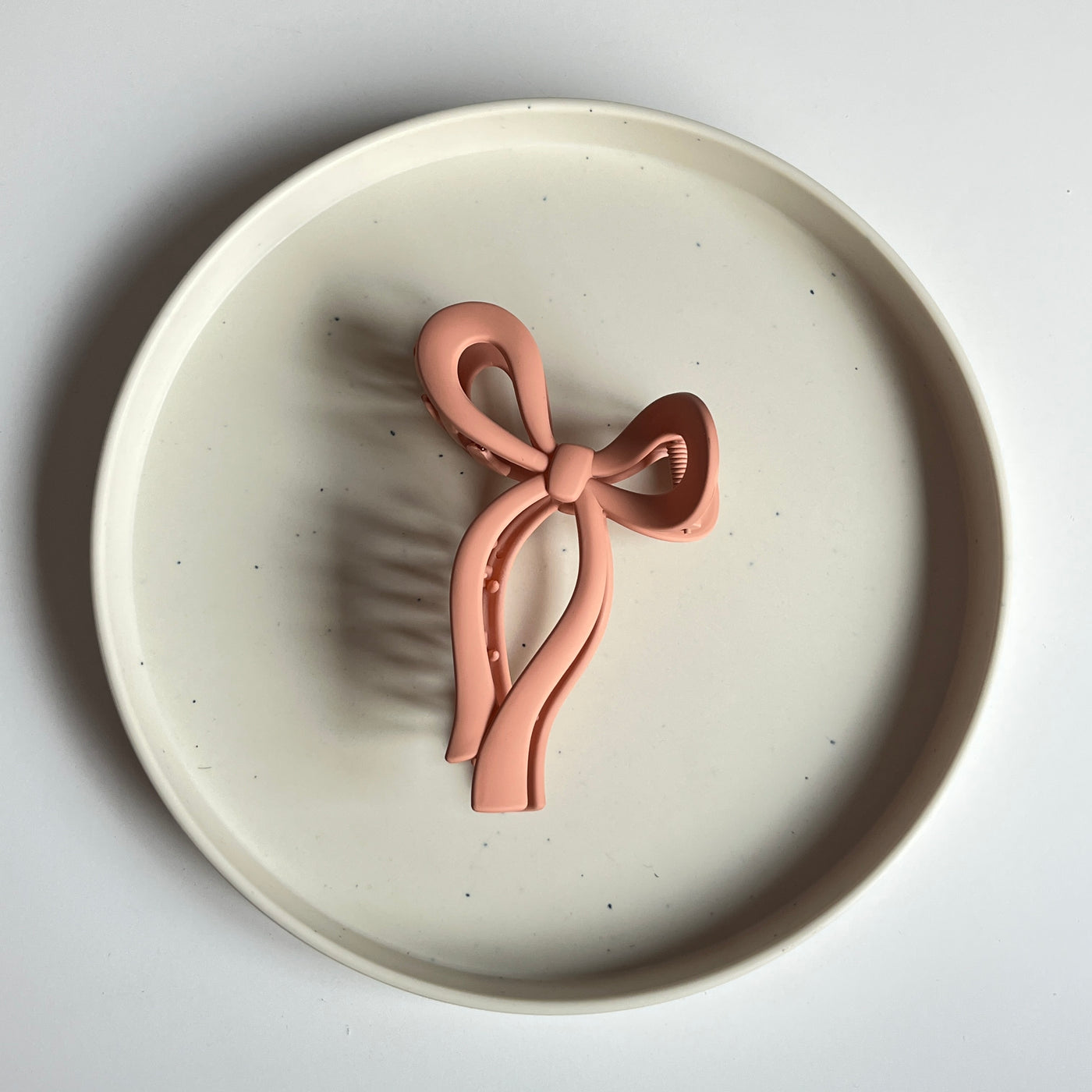 A soft matte bow-shaped claw that adds a cute yet minimal touch to any hairstyle.