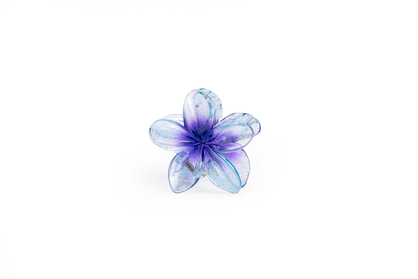 A radiant flower-shaped hair claw designed with layered translucent petals and a subtle glitter finish. Crafted in a large size, this claw provides a strong, comfortable hold while adding a luminous, statement touch to everyday and occasion hairstyles.