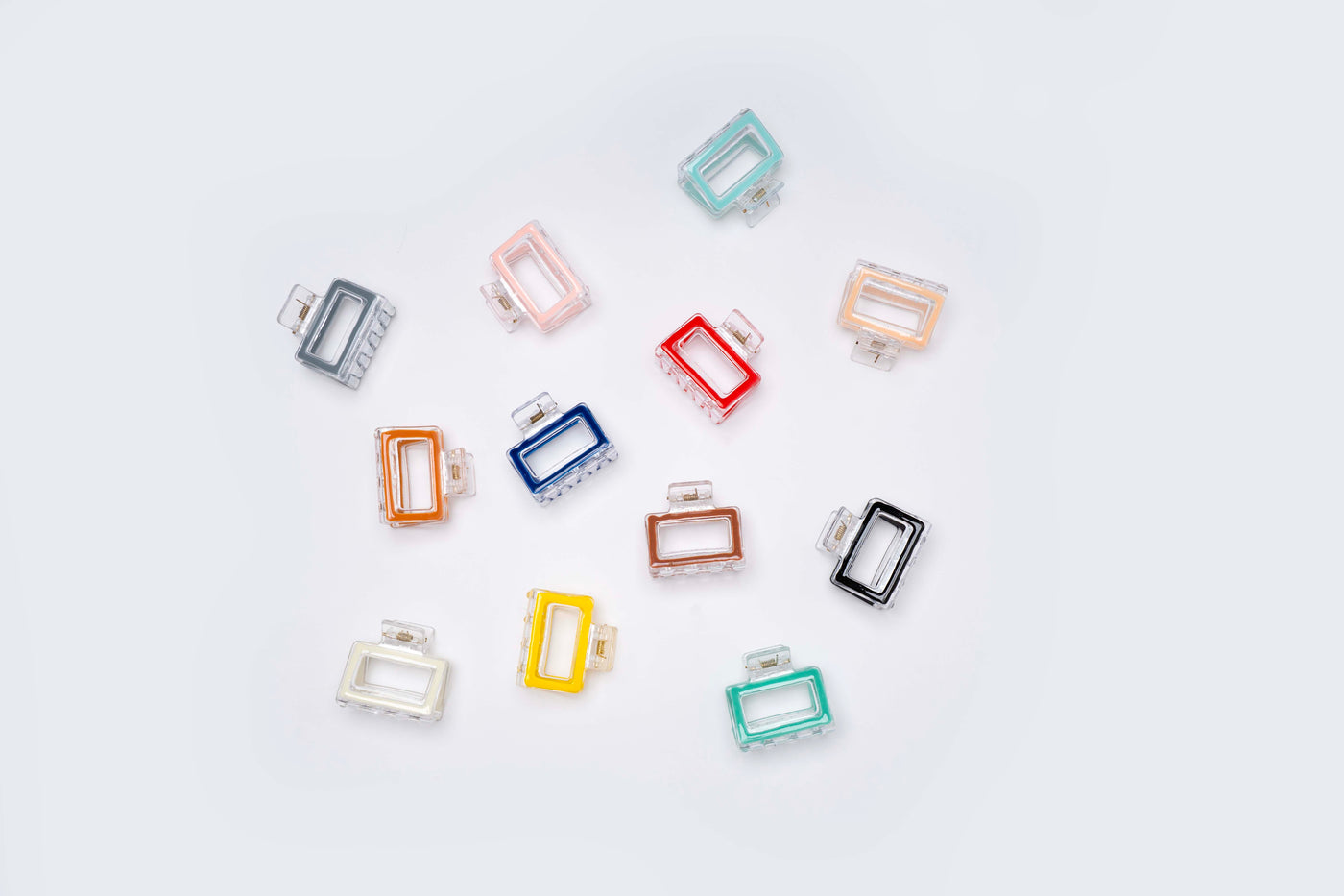 A coordinated set of twelve rectangular frame-style hair claws featuring a glossy transparent finish in a vibrant mix of classic, pastel, and bold shades. Designed in a medium size, these claws provide a secure grip and versatile styling options, making them ideal for daily wear, gifting, or building a complete hair accessory collection.