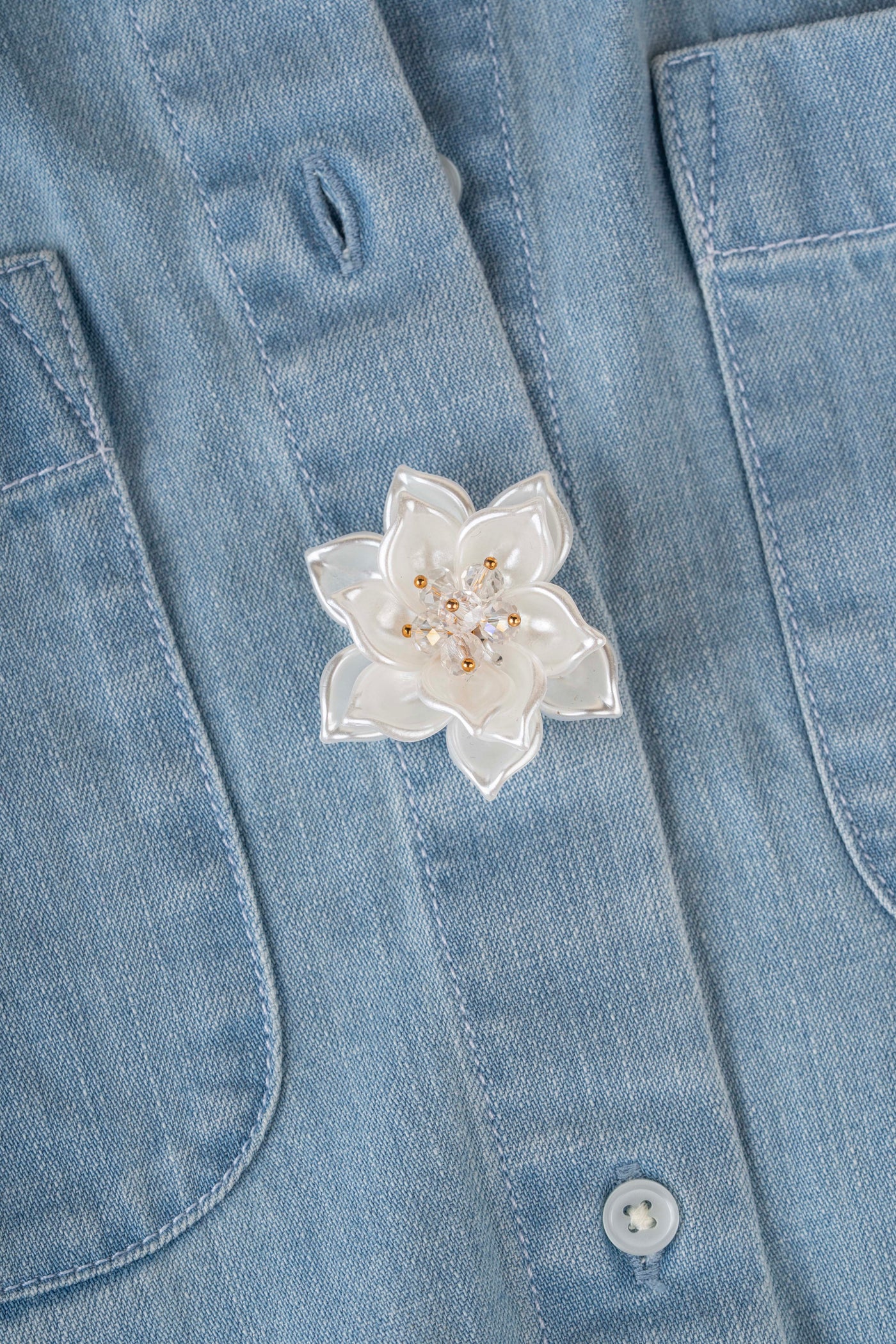 Meliora is a delicately sculpted floral button cover featuring luminous ivory enamel petals adorned with pearl accents and subtle crystal detailing. Softly radiant and beautifully balanced, it brings timeless elegance to any blouse or shirt.